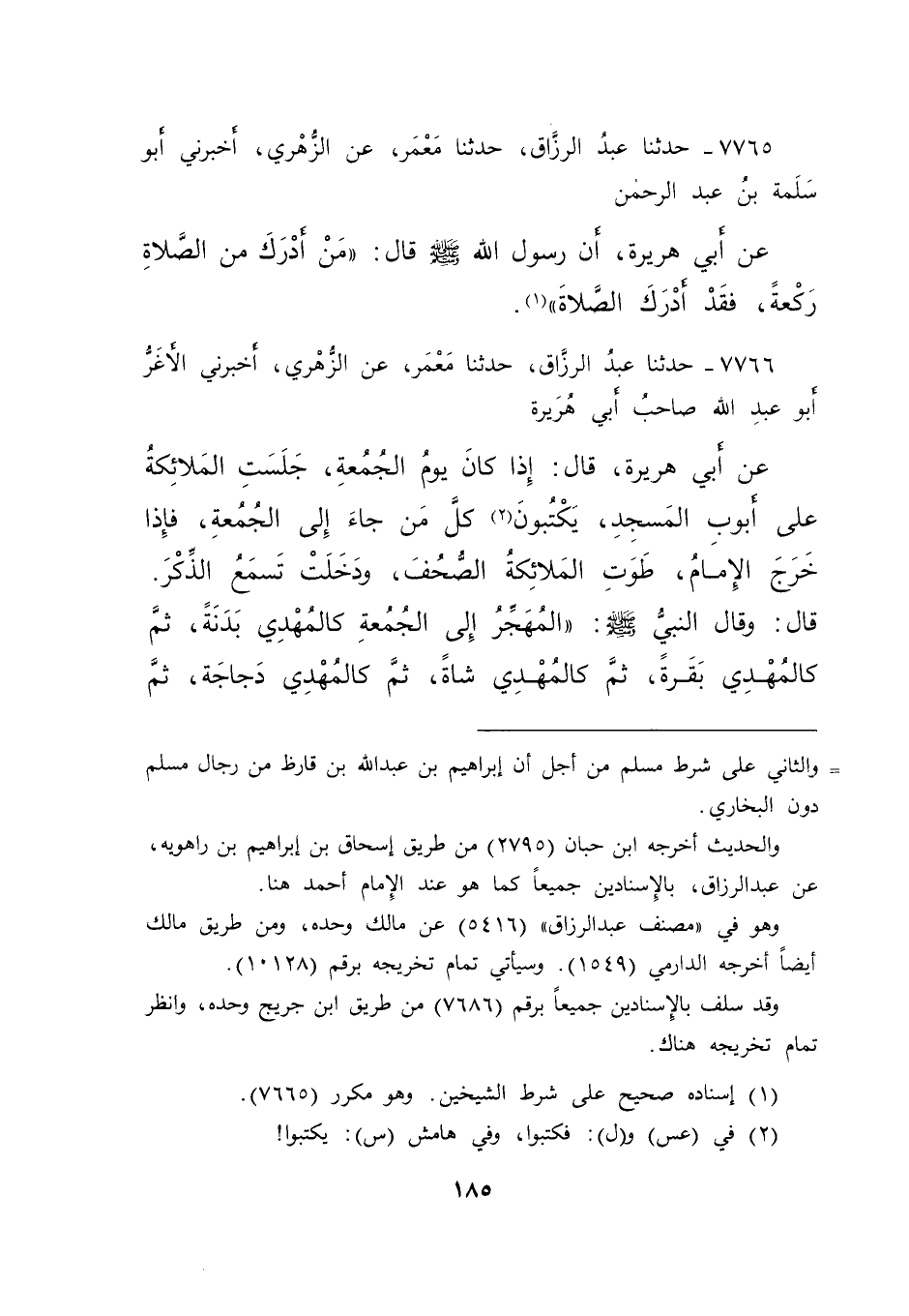 ٧٧٦٦ - حَدَّثَنَا عَبْدُ الرَّزَّاقِ، حَدَّثَنَا مَعْمَرٌ، عَنِ الزُّهْرِيِّ، أَخْبَرَنِي الْأَغَرُّ أَبُو عَبْدِ اللهِ، صَاحِبُ أَبِي هُرَيْرَةَ، عَنْ أَبِي هُرَيْرَةَ، قَالَ: " إِذَا كَانَ يَوْمُ الْجُمُعَةِ، جَلَسَتِ الْمَلَائِكَةُ عَلَى أَبْوَابِ الْمَسْجِدِ، يَكْتُبُونَ (٢) كُلَّ مَنْ جَاءَ إِلَى الْجُمُعَةِ، فَإِذَا خَرَجَ الْإِمَامُ، طَوَتِ الْمَلَائِكَةُ الصُّحُفَ، وَدَخَلَتْ تَسْمَعُ الذِّكْرَ "