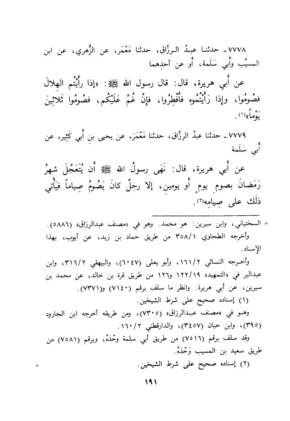 ٧٧٧٩ - حَدَّثَنَا عَبْدُ الرَّزَّاقِ، حَدَّثَنَا مَعْمَرٌ، عَنْ يَحْيَى بْنِ أَبِي كَثِيرٍ، عَنْ أَبِي سَلَمَةَ، عَنْ أَبِي هُرَيْرَةَ، قَالَ: " نَهَى رَسُولُ اللهِ صَلَّى اللهُ عَلَيْهِ وَسَلَّمَ أَنْ يُتَعَجَّلَ شَهْرُ رَمَضَانَ بِصَوْمِ يَوْمٍ أَوْ يَوْمَيْنِ، إِلَّا رَجُلٌ كَانَ يَصُومُ صِيَامًا فَيَأْتِي ذَلِكَ عَلَى صِيَامِهِ " (٢)