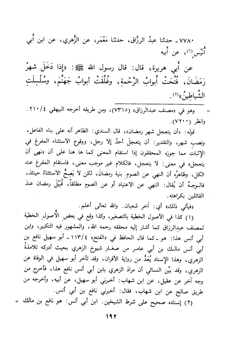 ٧٧٨٠ - حَدَّثَنَا عَبْدُ الرَّزَّاقِ، حَدَّثَنَا مَعْمَرٌ، عَنِ الزُّهْرِيِّ، عَنِ ابْنِ أَبِي أُنَيْسٍ (١) ، عَنْ أَبِيهِ، عَنْ أَبِي هُرَيْرَةَ، قَالَ: قَالَ رَسُولُ اللهِ صَلَّى اللهُ عَلَيْهِ وَسَلَّمَ: " إِذَا دَخَلَ شَهْرُ رَمَضَانَ، فُتِّحَتْ أَبْوَابُ الرَّحْمَةِ، وَغُلِّقَتْ أَبْوَابُ جَهَنَّمَ، وَسُلْسِلَتِ الشَّيَاطِينُ " (٢)