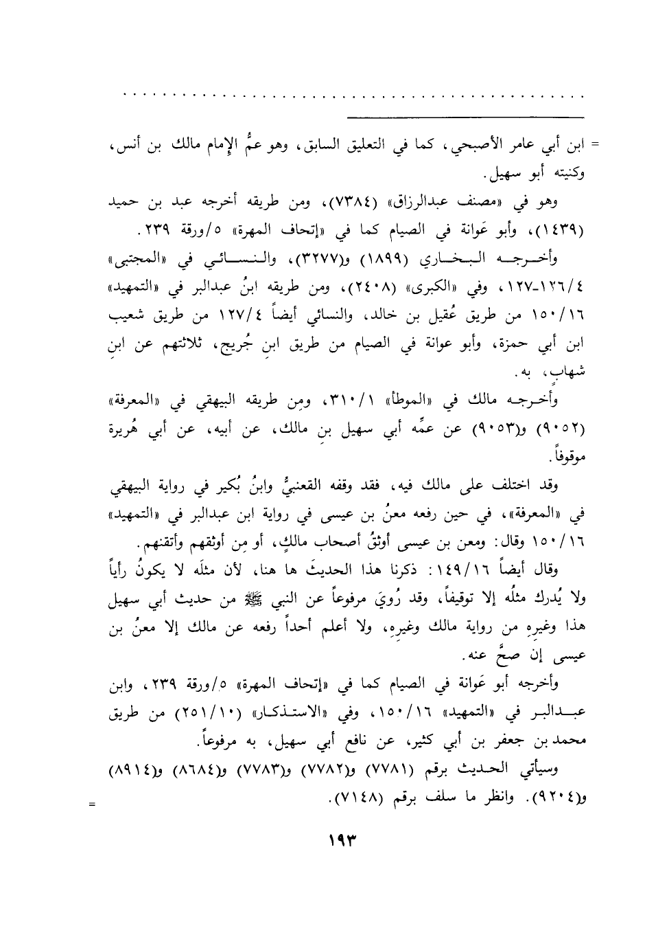 وقال أيضاً ١٦/١٤٩: ذكرنا هذا الحديثَ ها هنا، لأن مثلَه لا يكونُ رأياً ولا يُدرك مثلُه إلا توقيفاً، وقد رُويَ مرفوعاً عن النبي صَلَّى اللهُ عَلَيْهِ وَسَلَّمَ من حديث أبي سهيل هذا وغيرِهِ من رواية مالك وغيرِهِ، ولا أعلم أحداً رفعه عن مالك إلا معنُ بن عيسى إن صحَّ عنه.