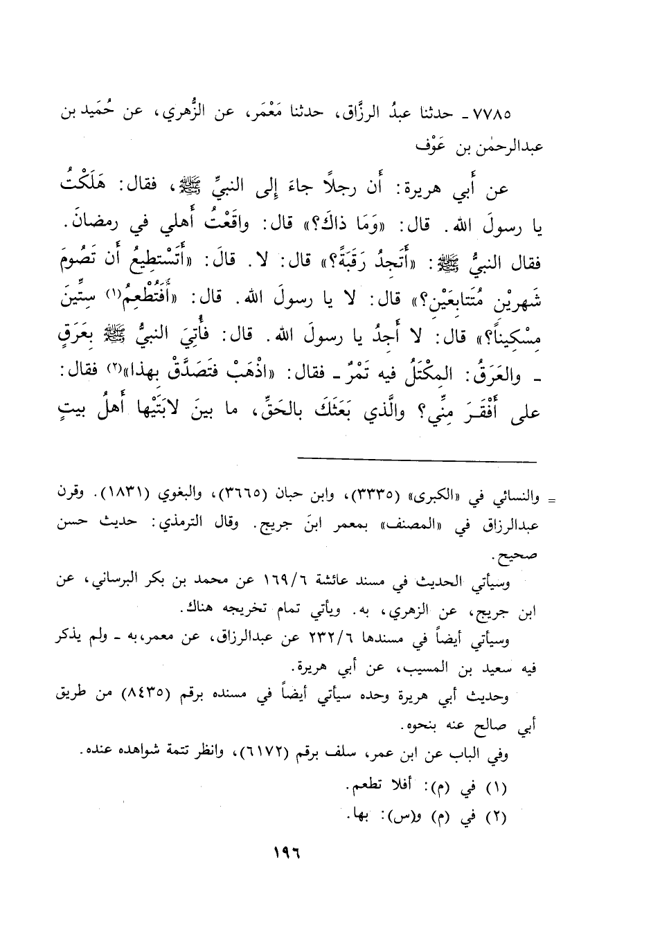 ٧٧٨٥ - حَدَّثَنَا عَبْدُ الرَّزَّاقِ، حَدَّثَنَا مَعْمَرٌ، عَنِ الزُّهْرِيِّ، عَنْ حُمَيْدِ بْنِ عَبْدِ الرَّحْمَنِ بْنِ عَوْفٍ، عَنْ أَبِي هُرَيْرَةَ: أَنَّ رَجُلًا جَاءَ إِلَى النَّبِيِّ صَلَّى اللهُ عَلَيْهِ وَسَلَّمَ، فَقَالَ: هَلَكْتُ يَا رَسُولَ اللهِ. قَالَ: " وَمَا ذَاكَ؟ " قَالَ: وَاقَعْتُ أَهْلِي فِي رَمَضَانَ. فَقَالَ النَّبِيُّ صَلَّى اللهُ عَلَيْهِ وَسَلَّمَ: " أَتَجِدُ رَقَبَةً؟ " قَالَ: لَا. قَالَ: " أَتَسْتَطِيعُ أَنْ تَصُومَ شَهْرَيْنِ مُتَتَابِعَيْنِ؟ " قَالَ: لَا يَا رَسُولَ اللهِ. قَالَ: " أَفَتُطْعِمُ (١) سِتِّينَ مِسْكِينًا؟ " قَالَ: لَا أَجِدُ يَا رَسُولَ اللهِ. قَالَ: فَأُتِيَ النَّبِيُّ صَلَّى اللهُ عَلَيْهِ وَسَلَّمَ بِعَرْقٍ - وَالْعَرْقُ: الْمِكْتَلُ فِيهِ تَمْرٌ - فقَالَ: " اذْهَبْ فَتَصَدَّقْ بِهَذا " (٢) فَقَالَ: عَلَى أَفْقَرَ مِنِّي؟ وَالَّذِي بَعَثَكَ بِالْحَقِّ، مَا بَيْنَ لَابَتَيْهَا أَهْلُ بَيْتٍ