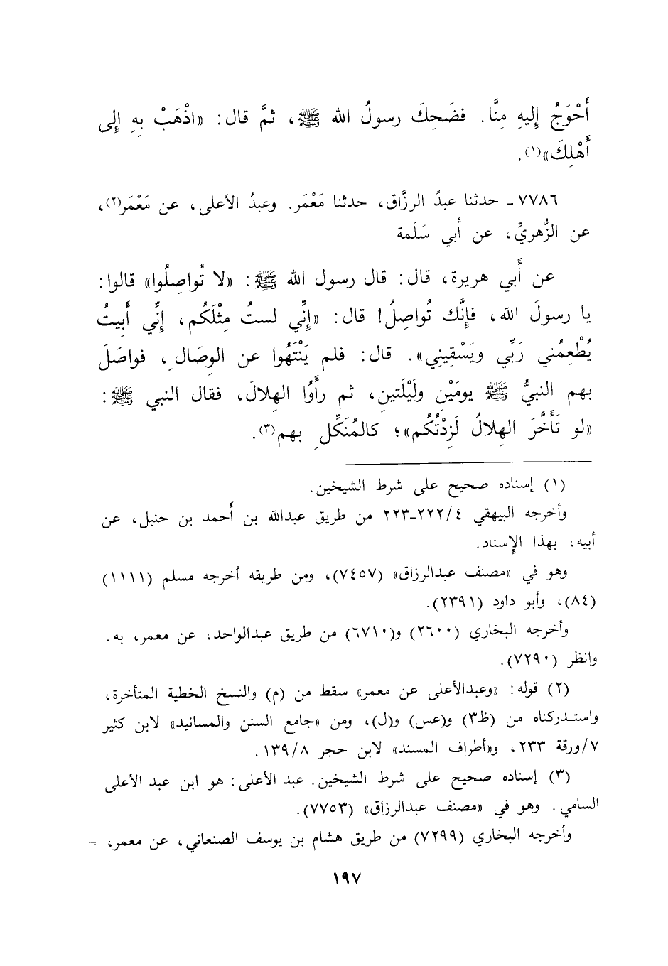 ٧٧٨٦ - حَدَّثَنَا عَبْدُ الرَّزَّاقِ، حَدَّثَنَا مَعْمَرٌ، وَعَبْدُ الْأَعْلَى (٢) ، عَنْ مَعْمَرٍ، عَنِ الزُّهْرِيِّ، عَنْ أَبِي سَلَمَةَ، عَنْ أَبِي هُرَيْرَةَ، قَالَ: قَالَ رَسُولُ اللهِ صَلَّى اللهُ عَلَيْهِ وَسَلَّمَ: " لَا تُوَاصِلُوا " قَالُوا: يَا رَسُولَ اللهِ، إِنَّكَ تُوَاصِلُ قَالَ: " إِنِّي لَسْتُ مِثْلَكُمْ، إِنِّي أَبِيتُ يُطْعِمُنِي رَبِّي وَيَسْقِينِي ". قَالَ: فَلَمْ يَنْتَهُوا عَنِ الْوِصَالِ، فَوَاصَلَ بِهِمُ النَّبِيُّ صَلَّى اللهُ عَلَيْهِ وَسَلَّمَ يَوْمَيْنِ وَلَيْلَتَيْنِ، ثُمَّ رَأَوْا الْهِلَالَ، فَقَالَ النَّبِيُّ صَلَّى اللهُ عَلَيْهِ وَسَلَّمَ: " لَوْ تَأَخَّرَ الْهِلَالُ لَزِدْتُكُمْ "، كَالْمُنَكِّلِ بِهِمْ (٣)
