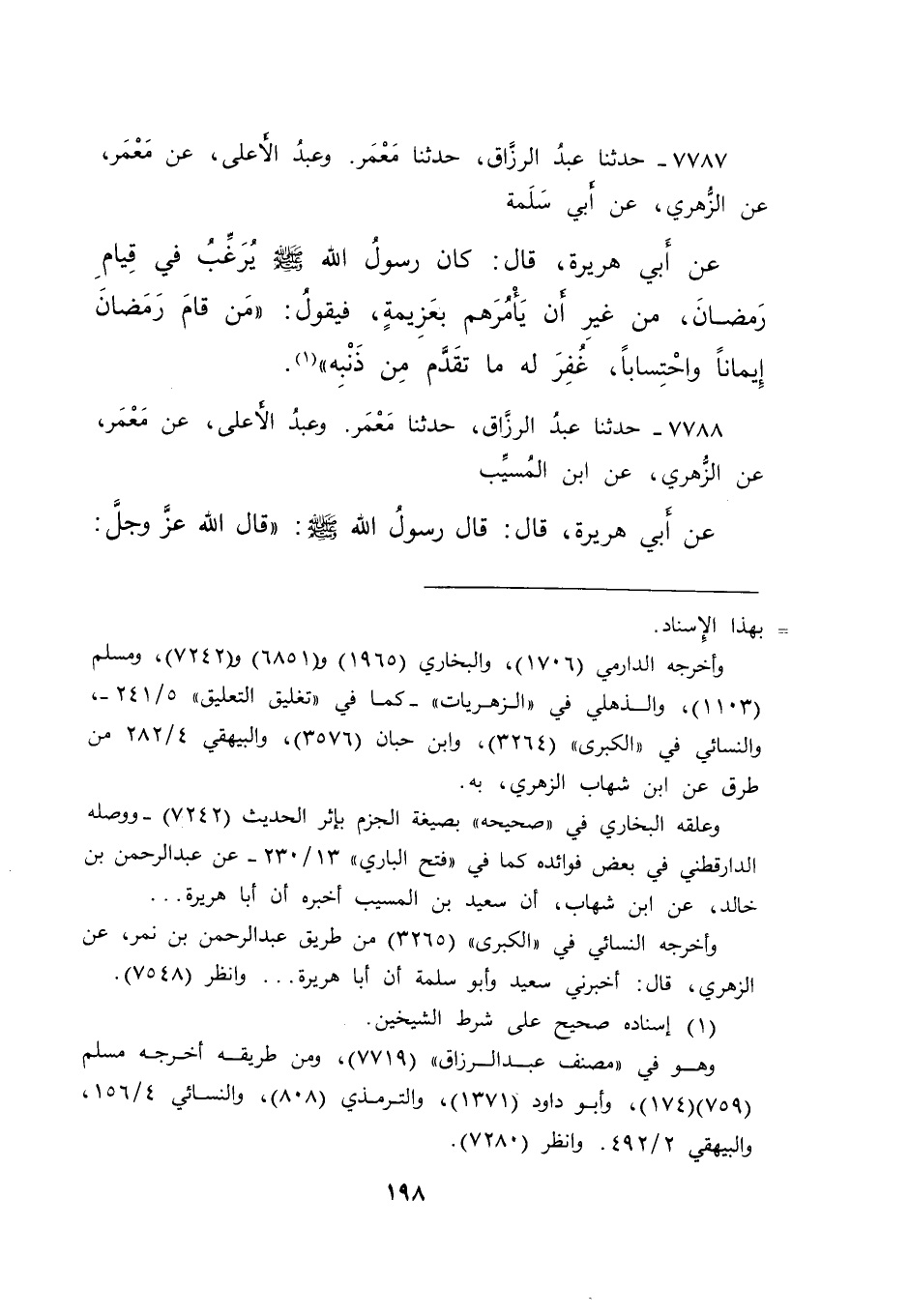٧٧٨٧ - حَدَّثَنَا عَبْدُ الرَّزَّاقِ، حَدَّثَنَا مَعْمَرٌ، وَعَبْدُ الْأَعْلَى، عَنْ مَعْمَرٍ، عَنِ الزُّهْرِيِّ، عَنْ أَبِي سَلَمَةَ، عَنْ أَبِي هُرَيْرَةَ، قَالَ: كَانَ رَسُولُ اللهِ صَلَّى اللهُ عَلَيْهِ وَسَلَّمَ يُرَغِّبُ فِي قِيَامِ رَمَضَانَ، مِنْ غَيْرِ أَنْ يَأْمُرَهُمْ بِعَزِيمَةٍ، فَيَقُولُ: " مَنْ قَامَ رَمَضَانَ إِيمَانًا وَاحْتِسَابًا، غُفِرَ لَهُ مَا تَقَدَّمَ مِنْ ذَنْبِهِ " (١)