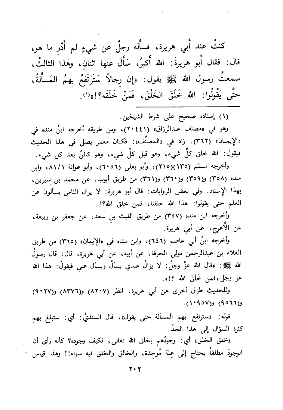 كُنْتُ عِنْدَ أَبِي هُرَيْرَةَ، فَسَأَلَهُ رَجُلٌ عَنْ شَيْءٍ لَمْ أَدْرِ مَا هُوَ، قَالَ: فَقَالَ أَبُو هُرَيْرَةَ: اللهُ أَكْبَرُ، سَأَلَ عَنْهَا اثْنَانِ، وَهَذَا الثَّالِثُ، سَمِعْتُ رَسُولَ اللهِ صَلَّى اللهُ عَلَيْهِ وَسَلَّمَ يَقُولُ: " إِنَّ رِجَالًا سَتَرْتَفِعُ بِهِمُ الْمَسْأَلَةُ، حَتَّى يَقُولُوا: اللهُ خَلَقَ الْخَلْقَ، فَمَنْ خَلَقَهُ؟ " (١)