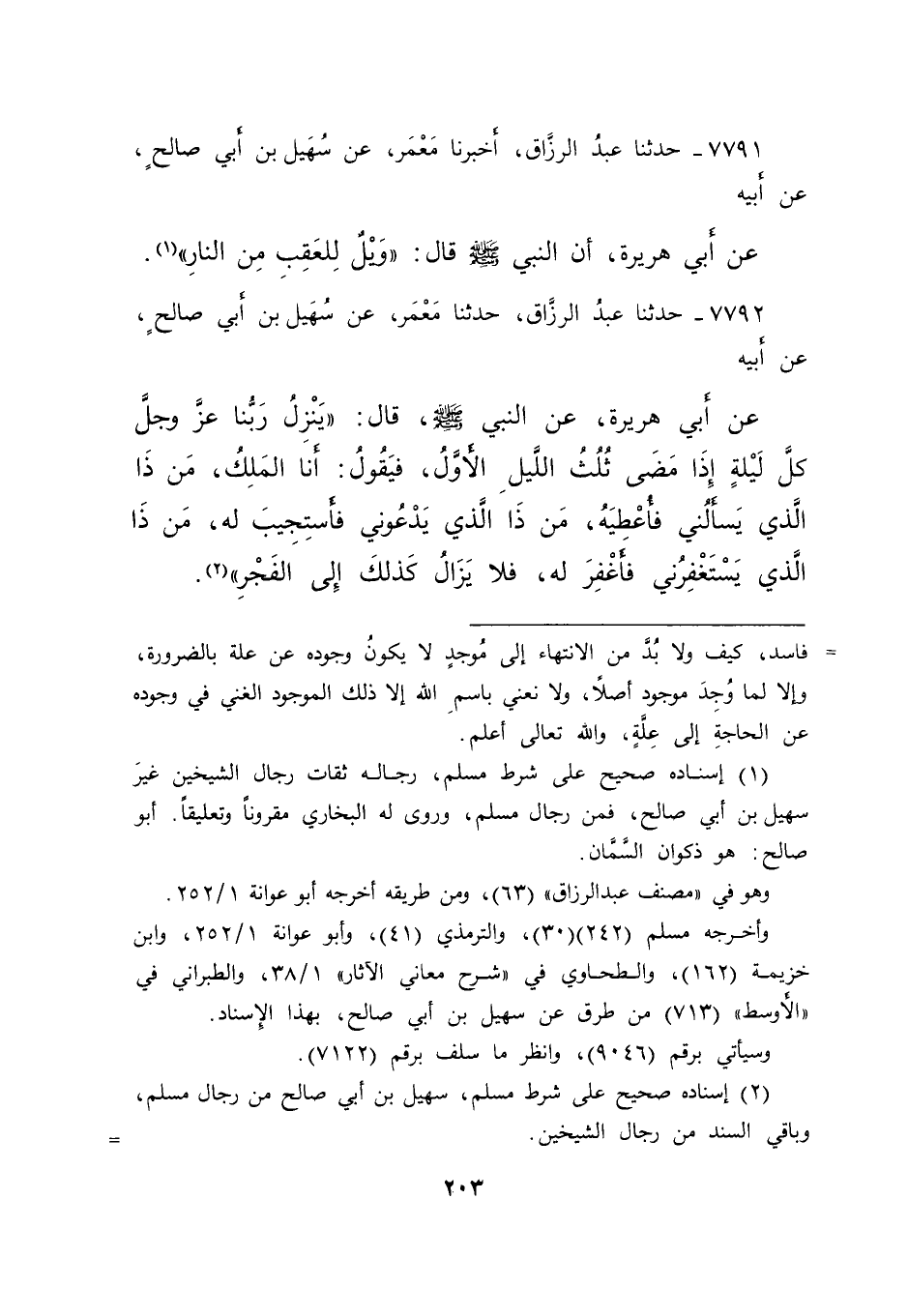 ٧٧٩٢ - حَدَّثَنَا عَبْدُ الرَّزَّاقِ، حَدَّثَنَا مَعْمَرٌ، عَنْ سُهَيْلِ بْنِ أَبِي صَالِحٍ، عَنْ أَبِيهِ، عَنْ أَبِي هُرَيْرَةَ، عَنِ النَّبِيِّ صَلَّى اللهُ عَلَيْهِ وَسَلَّمَ قَالَ: " يَنْزِلُ رَبُّنَا عَزَّ وَجَلَّ كُلَّ لَيْلَةٍ إِذَا مَضَى ثُلُثُ اللَّيْلِ الْأَوَّلِ، فَيَقُولُ: أَنَا الْمَلِكُ، مَنْ ذَا الَّذِي يَسْأَلُنِي فَأُعْطِيَهُ، مَنْ ذَا الَّذِي يَدْعُونِي فَأَسْتَجِيبَ لَهُ، مَنْ ذَا الَّذِي يَسْتَغْفِرُنِي فَأَغْفِرَ لَهُ، فَلَا يَزَالُ كَذَلِكَ إِلَى الْفَجْرِ " (٢)