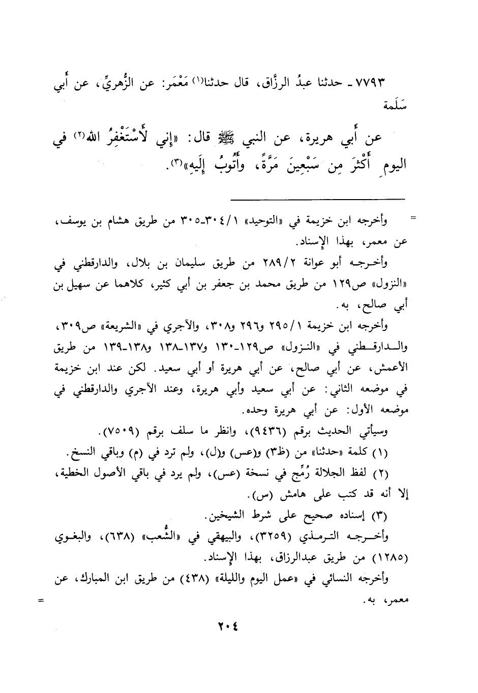 ٧٧٩٣ - حَدَّثَنَا عَبْدُ الرَّزَّاقِ، قَالَ: حَدَّثَنَا (١) مَعْمَرٌ: عَنِ الزُّهْرِيِّ، عَنْ أَبِي سَلَمَةَ، عَنْ أَبِي هُرَيْرَةَ، عَنِ النَّبِيِّ صَلَّى اللهُ عَلَيْهِ وَسَلَّمَ قَالَ: " إِنِّي لَأَسْتَغْفِرُ اللهَ (٢) فِي الْيَوْمِ أَكْثَرَ مِنْ سَبْعِينَ مَرَّةً، وَأَتُوبُ إِلَيْهِ " (٣)