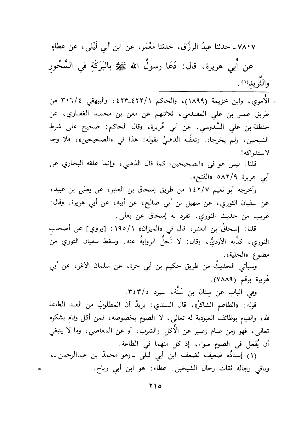 ٧٨٠٧ - حَدَّثَنَا عَبْدُ الرَّزَّاقِ، حَدَّثَنَا مَعْمَرٌ، عَنِ ابْنِ أَبِي لَيْلَى، عَنْ عَطَاءٍ، عَنْ أَبِي هُرَيْرَةَ، قَالَ: " دَعَا رَسُولُ اللهِ صَلَّى اللهُ عَلَيْهِ وَسَلَّمَ بِالْبَرَكَةِ فِي السَّحُورِ وَالثَّرِيدِ " (١)