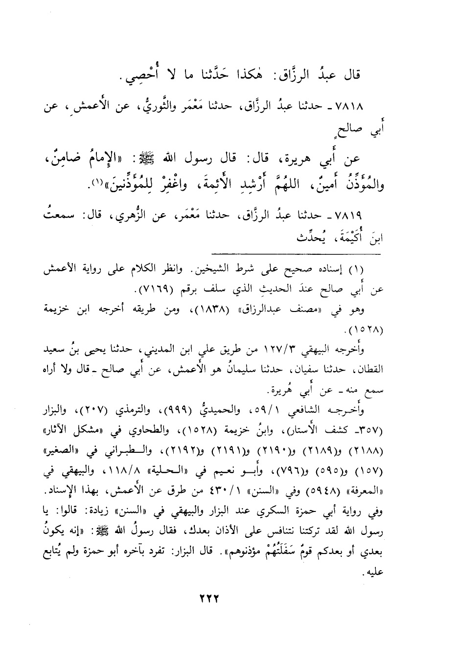 ٧٨١٨ - حَدَّثَنَا عَبْدُ الرَّزَّاقِ، حَدَّثَنَا مَعْمَرٌ، وَالثَّوْرِيُّ، عَنِ الْأَعْمَشِ، عَنِ أَبِي صَالِحٍ، عَنْ أَبِي هُرَيْرَةَ، قَالَ رَسُولُ اللهِ صَلَّى اللهُ عَلَيْهِ وَسَلَّمَ: " الْإِمَامُ ضَامِنٌ، وَالْمُؤَذِّنُ أَمِينٌ، اللهُمَّ أَرْشِدِ الْأَئِمَّةَ، وَاغْفِرْ لِلْمُؤَذِّنِينَ " (١)