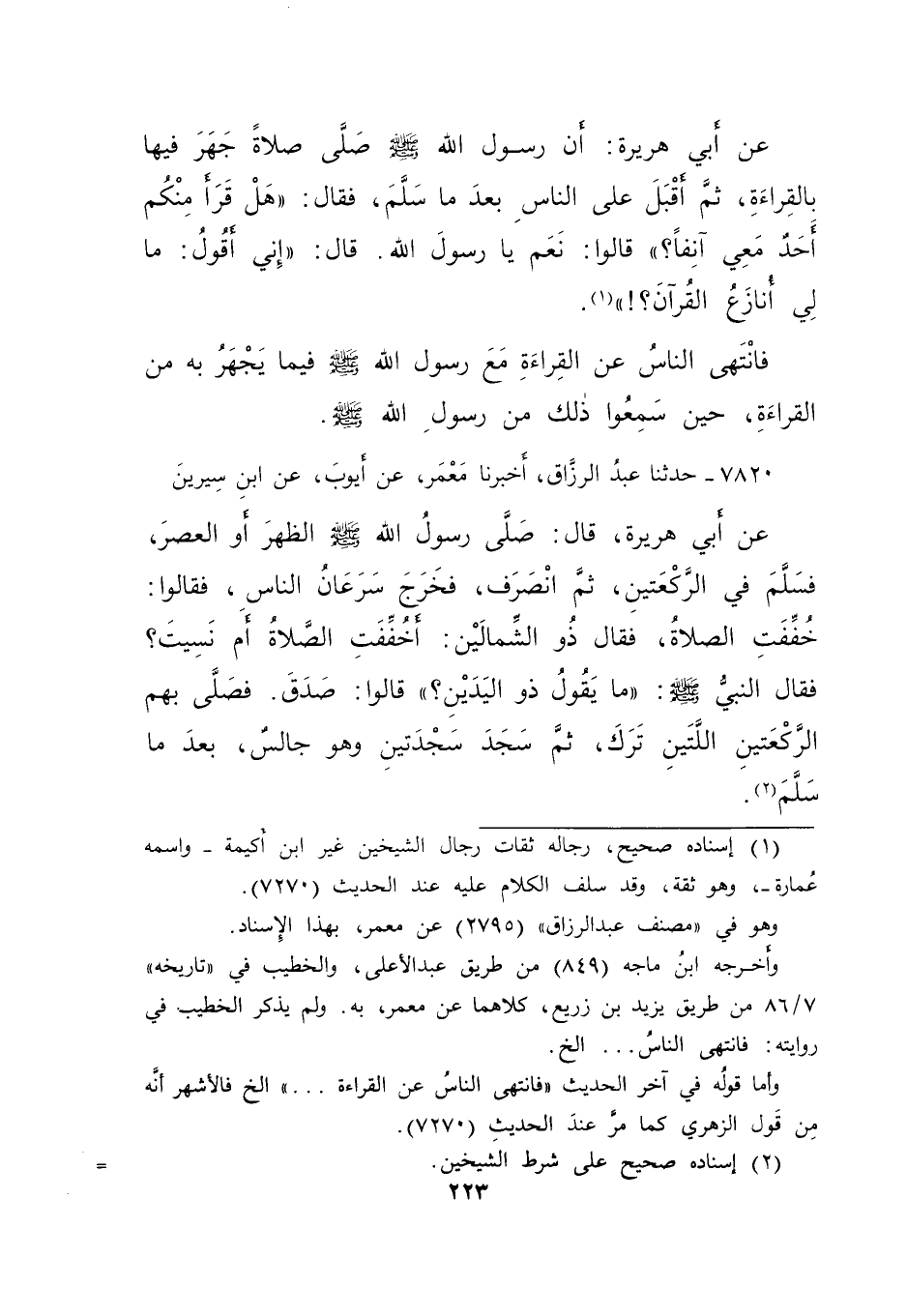 ٧٨٢٠ - حَدَّثَنَا عَبْدُ الرَّزَّاقِ، أَخْبَرَنَا مَعْمَرٌ، عَنْ أَيُّوبَ، عَنِ ابْنِ سِيرِينَ، عَنْ أَبِي هُرَيْرَةَ، قَالَ: صَلَّى رَسُولُ اللهِ صَلَّى اللهُ عَلَيْهِ وَسَلَّمَ الظُّهْرَ أَوِ الْعَصْرَ، فَسَلَّمَ فِي الرَّكْعَتَيْنِ، ثُمَّ انْصَرَفَ، فَخَرَجَ سُرْعَانُ النَّاسِ، فَقَالُوا: خُفِّفَتِ الصَّلَاةُ، فَقَالَ ذُو الشِّمَالَيْنِ: أَخُفِّفَتِ الصَّلَاةُ أَمْ نَسِيتَ؟ فَقَالَ النَّبِيُّ صَلَّى اللهُ عَلَيْهِ وَسَلَّمَ: " مَا يَقُولُ ذُو الْيَدَيْنِ؟ " قَالُوا: صَدَقَ. فَصَلَّى بِهِمُ الرَّكْعَتَيْنِ اللَّتَيْنِ تَرَكَ، ثُمَّ سَجَدَ سَجْدَتَيْنِ وَهُوَ جَالِسٌ، بَعْدَ مَا سَلَّمَ (٢)