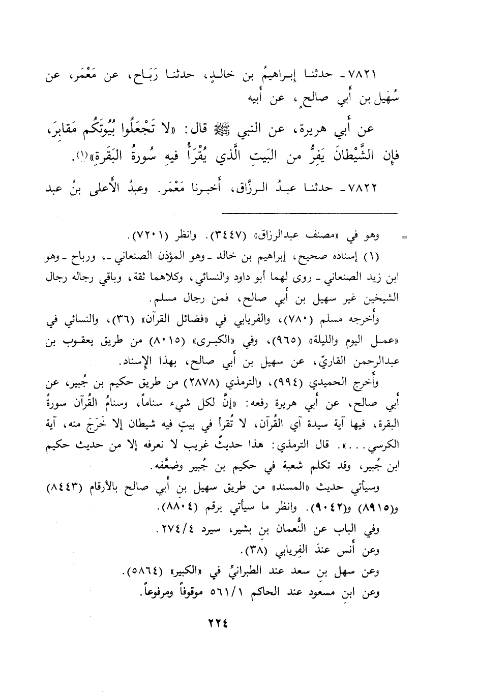 ٧٨٢١ - حَدَّثَنَا إِبْرَاهِيمُ بْنُ خَالِدٍ، حَدَّثَنَا رَبَاحٌ، عَنْ مَعْمَرٍ، عَنْ سُهَيْلِ بْنِ أَبِي صَالِحٍ، عَنْ أَبِيهِ، عَنْ أَبِي هُرَيْرَةَ، عَنِ النَّبِيِّ صَلَّى اللهُ عَلَيْهِ وَسَلَّمَ قَالَ: " لَا تَجْعَلُوا بُيُوتَكُمْ مَقَابِرَ، فَإِنَّ الشَّيْطَانَ يَفِرُّ مِنَ الْبَيْتِ الَّذِي يُقْرَأُ فِيهِ سُورَةُ الْبَقَرَةِ " (١)