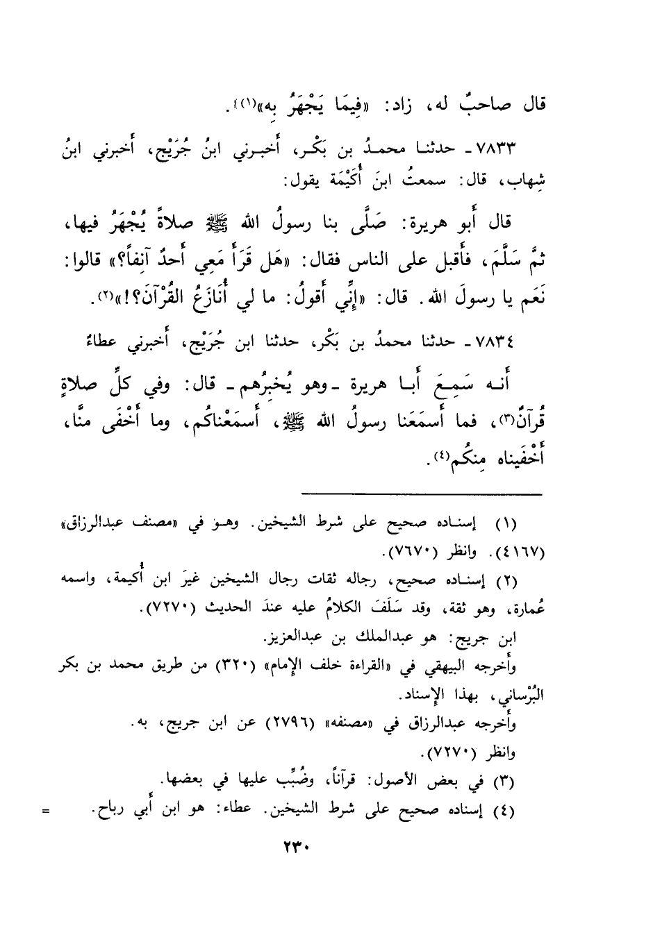٧٨٣٣ - حَدَّثَنَا مُحَمَّدُ بْنُ بَكْرٍ، أَخْبَرَنِي ابْنُ جُرَيْجٍ، أَخْبَرَنِي ابْنُ شِهَابٍ، قَالَ: سَمِعْتُ ابْنَ أُكَيْمَةَ، يَقُولُ: قَالَ أَبُو هُرَيْرَةَ: صَلَّى بِنَا رَسُولُ اللهِ صَلَّى اللهُ عَلَيْهِ وَسَلَّمَ صَلَاةً يَجْهَرُ فِيهَا، ثُمَّ سَلَّمَ، فَأَقْبَلَ عَلَى النَّاسِ فَقَالَ: " هَلْ قَرَأَ مَعِي أَحَدٌ آنِفًا؟ " قَالُوا: نَعَمْ يَا رَسُولَ اللهِ. قَالَ: " إِنِّي أَقُولُ مَا لِي أُنَازَعُ الْقُرْآنَ؟ " (٢)