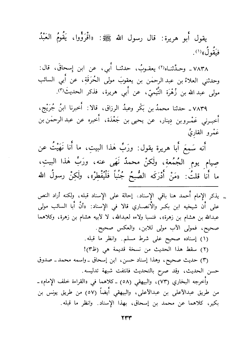 = يذكر الإِمام أَحمد هنا باقي الإسناد، إحالة على الإسناد قبله، ولكنه أراد النص على أَن شيخيه ابن بكر والأَنصاري قالا في الإسناد: "أنَّ أَبا السائب مولى عبد الله بن هشام بن زهرة"، فنسبا ولاءه لعبد الله، لا لأبية هشام بن زهرة، وكلاهما صحيح، فمولى الأب مولى للابن، والعكس صحيح.