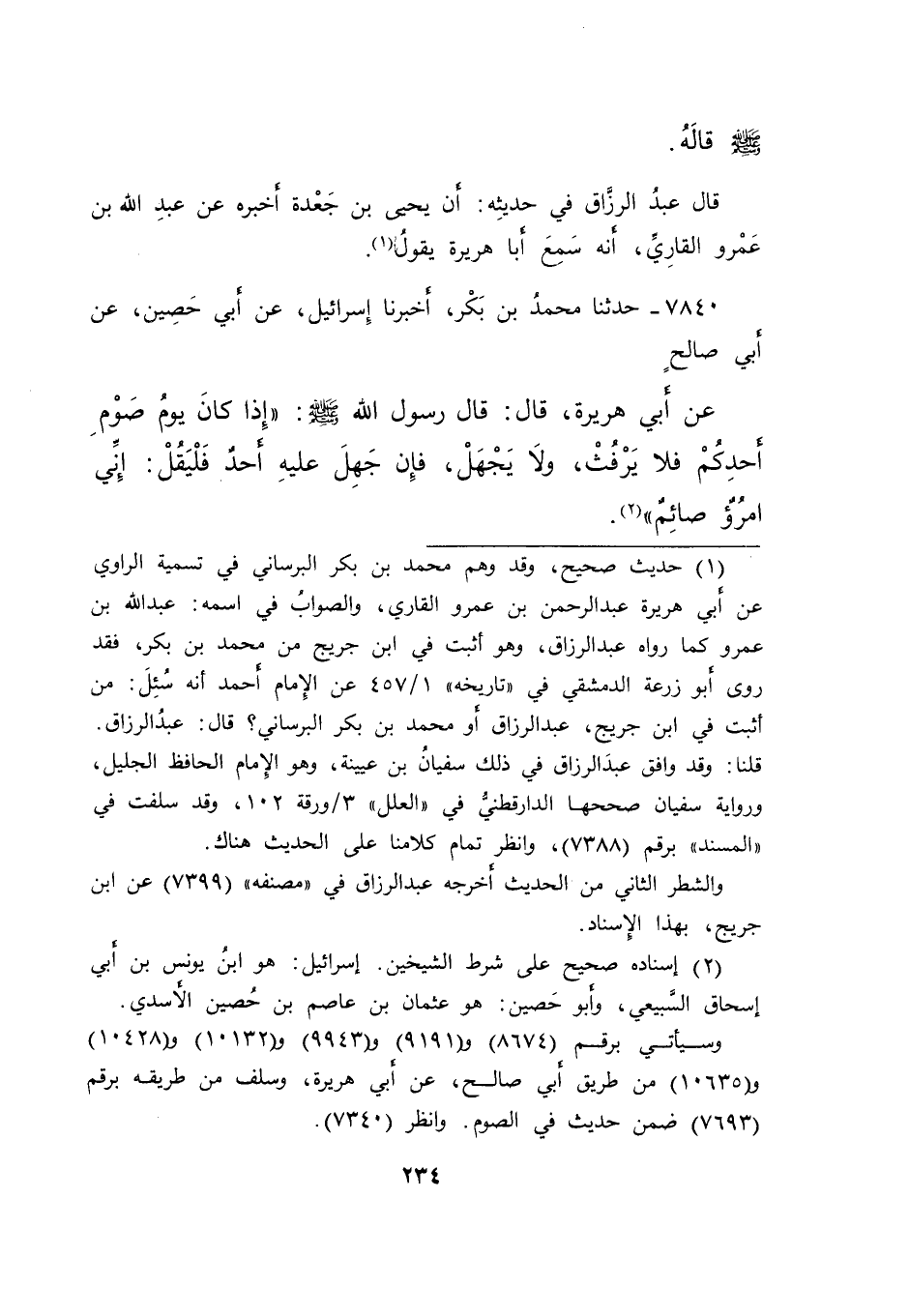٧٨٤٠ - حَدَّثَنَا مُحَمَّدُ بْنُ بَكْرٍ، أَخْبَرَنَا إِسْرَائِيلُ، عَنْ أَبِي حَصِينٍ، عَنْ أَبِي صَالِحٍ، عَنْ أَبِي هُرَيْرَةَ، قَالَ: قَالَ رَسُولُ اللهِ صَلَّى اللهُ عَلَيْهِ وَسَلَّمَ: " إِذَا كَانَ يَوْمُ صَوْمِ أَحَدِكُمْ فَلَا يَرْفُثْ، وَلَا يَجْهَلْ، فَإِنْ جَهِلَ عَلَيْهِ أَحَدٌ فَلْيَقُلْ: إِنِّي امْرُؤٌ صَائِمٌ " (٢)