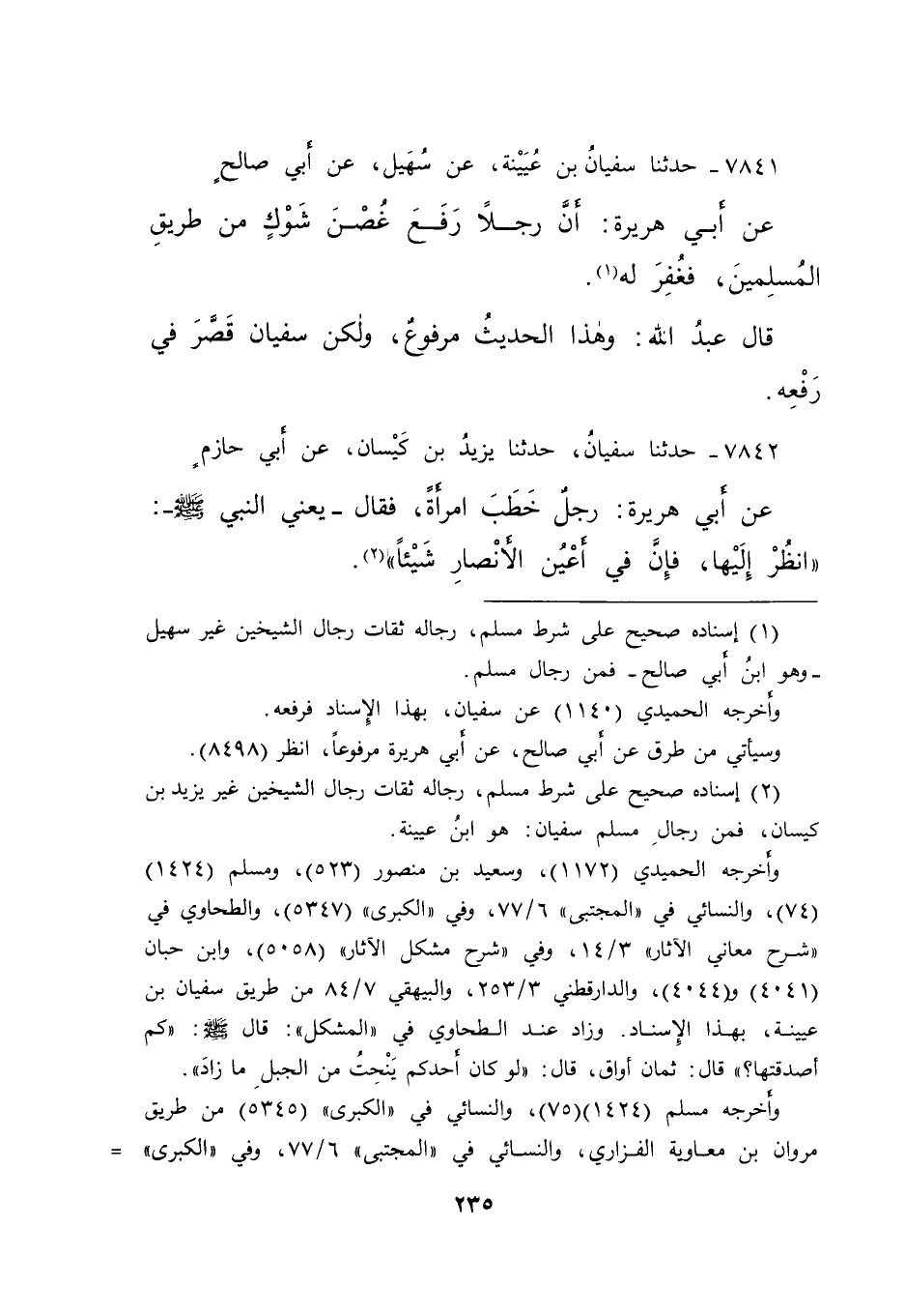 ٧٨٤٢ - حَدَّثَنَا سُفْيَانُ، حَدَّثَنَا يَزِيدُ بْنُ كَيْسَانَ، عَنْ أَبِي حَازِمٍ، عَنْ أَبِي هُرَيْرَةَ: رَجُلٌ خَطَبَ امْرَأَةً، فَقَالَ - يَعْنِي النَّبِيَّ صَلَّى اللهُ عَلَيْهِ وَسَلَّمَ -: " انْظُرْ إِلَيْهَا، فَإِنَّ فِي أَعْيُنِ الْأَنْصَارِ شَيْئًا " (٢)