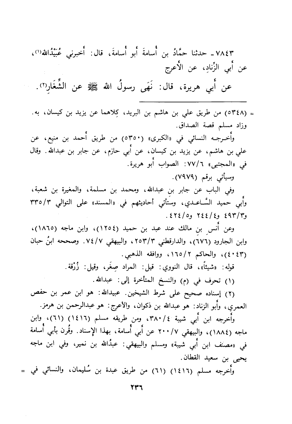 ٧٨٤٣ - حَدَّثَنَا حَمَّادُ بْنُ أُسَامَةَ أَبُو أُسَامَةَ، قَالَ: أَخْبَرَنِي عُبَيْدُ اللهِ (١) ، عَنْ أَبِي الزِّنَادِ، عَنِ الْأَعْرَجِ، عَنْ أَبِي هُرَيْرَةَ، قَالَ: " نَهَى رَسُولُ اللهِ صَلَّى اللهُ عَلَيْهِ وَسَلَّمَ عَنِ الشِّغَارِ " (٢)