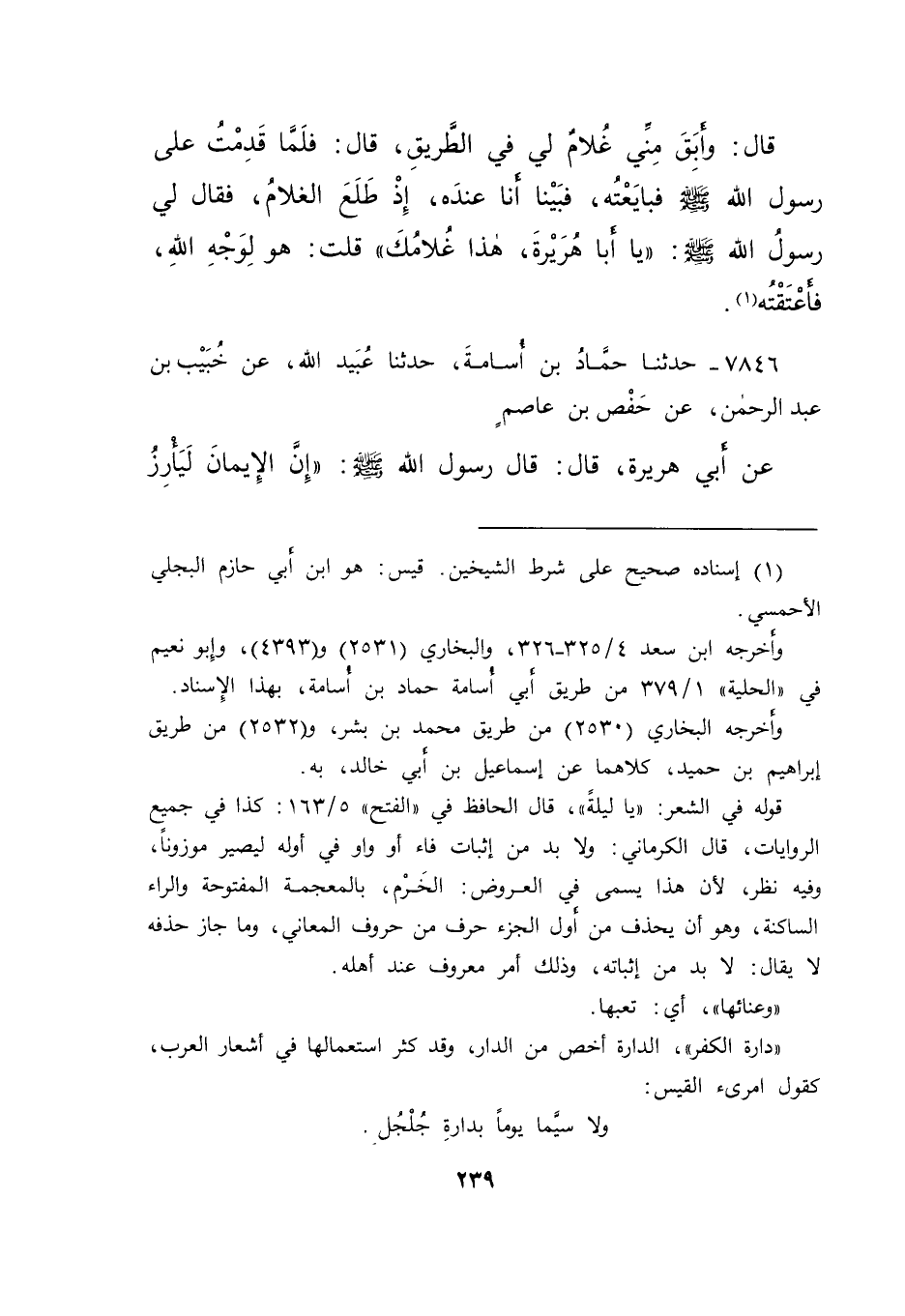 قَالَ: وَأَبَقَ مِنِّي غُلَامٌ لِي فِي الطَّرِيقِ، قَالَ: فَلَمَّا قَدِمْتُ عَلَى رَسُولِ اللهِ صَلَّى اللهُ عَلَيْهِ وَسَلَّمَ فَبَايَعْتُهُ، فَبَيْنَا أَنَا عِنْدَهُ، إِذْ طَلَعَ الْغُلَامُ، فَقَالَ لِي رَسُولُ اللهِ صَلَّى اللهُ عَلَيْهِ وَسَلَّمَ: " يَا أَبَا هُرَيْرَةَ، هَذَا غُلَامُكَ " قُلْتُ: هُوَ لِوَجْهِ اللهِ، فَأَعْتَقْتُهُ (١)