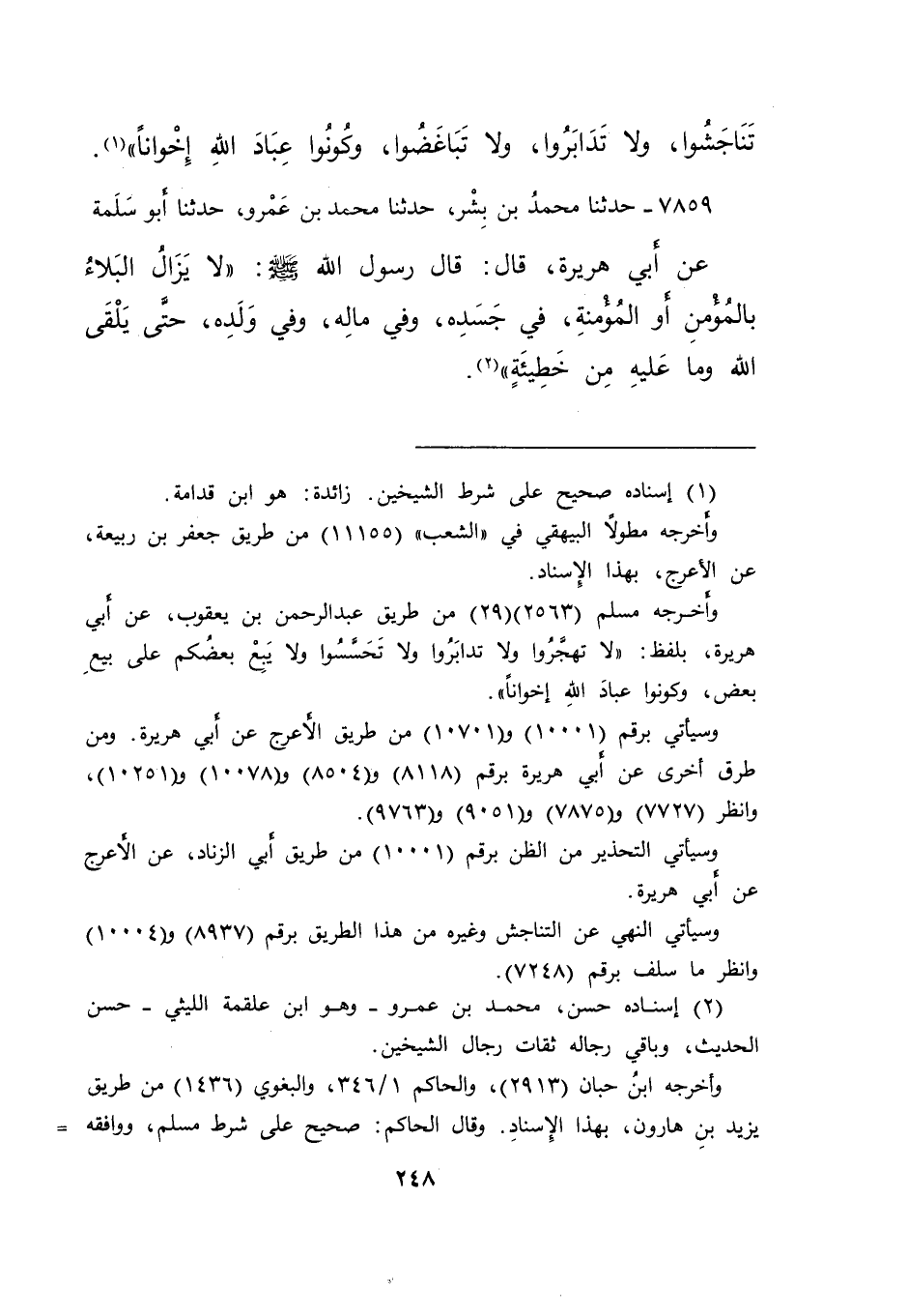 ٧٨٥٩ - حَدَّثَنَا مُحَمَّدُ بْنُ بِشْرٍ، حَدَّثَنَا مُحَمَّدُ بْنُ عَمْرٍو، حَدَّثَنَا أَبُو سَلَمَةَ، عَنْ أَبِي هُرَيْرَةَ، قَالَ: قَالَ رَسُولُ اللهِ صَلَّى اللهُ عَلَيْهِ وَسَلَّمَ: " لَا يَزَالُ الْبَلَاءُ بِالْمُؤْمِنِ أَوِ الْمُؤْمِنَةِ، فِي جَسَدِهِ، وَفِي مَالِهِ، وَفِي وَلَدِهِ، حَتَّى يَلْقَى اللهَ وَمَا عَلَيْهِ مِنْ خَطِيئَةٍ " (٢)