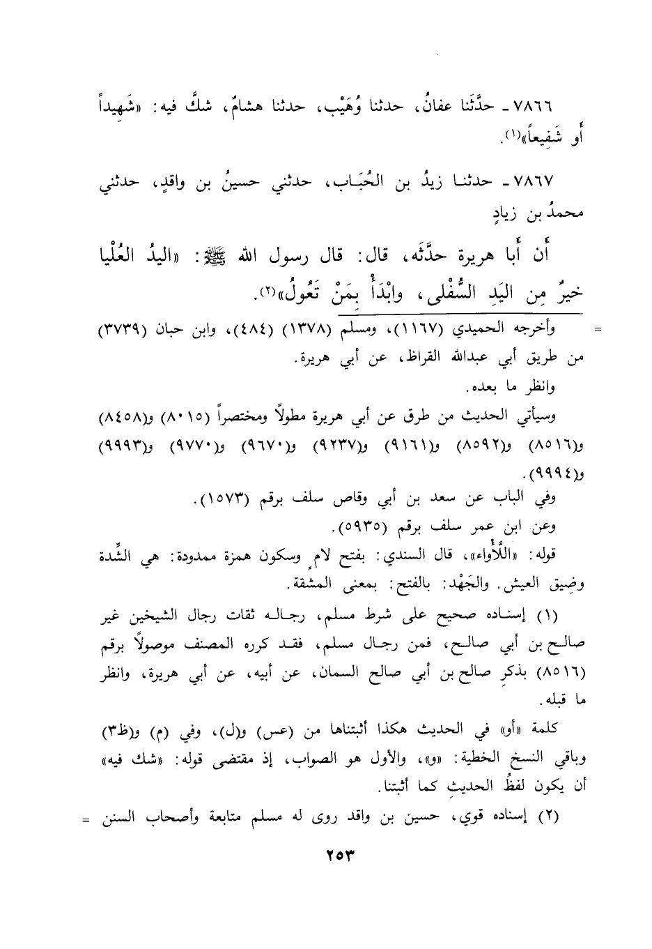 ٧٨٦٦ - حَدَّثَنَا عَفَّانُ، حَدَّثَنَا وُهَيْبٌ، حَدَّثَنَا هِشَامٌ، شَكَّ فِيهِ: " شَهِيدًا أَوْ شَفِيعًا " (١)