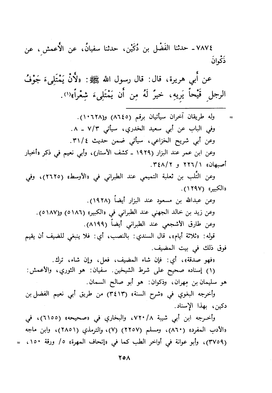 ٧٨٧٤ - حَدَّثَنَا الْفَضْلُ بْنُ دُكَيْنٍ، حَدَّثَنَا سُفْيَانُ، عَنِ الْأَعْمَشِ، عَنْ ذَكْوَانَ، عَنْ أَبِي هُرَيْرَةَ، قَالَ: قَالَ رَسُولُ اللهِ صَلَّى اللهُ عَلَيْهِ وَسَلَّمَ: " لَأَنْ يَمْتَلِئَ جَوْفُ الرَّجُلِ قَيْحًا يَرِيهِ، خَيْرٌ لَهُ مِنْ أَنْ يَمْتَلِئَ شِعْرًا " (١)
