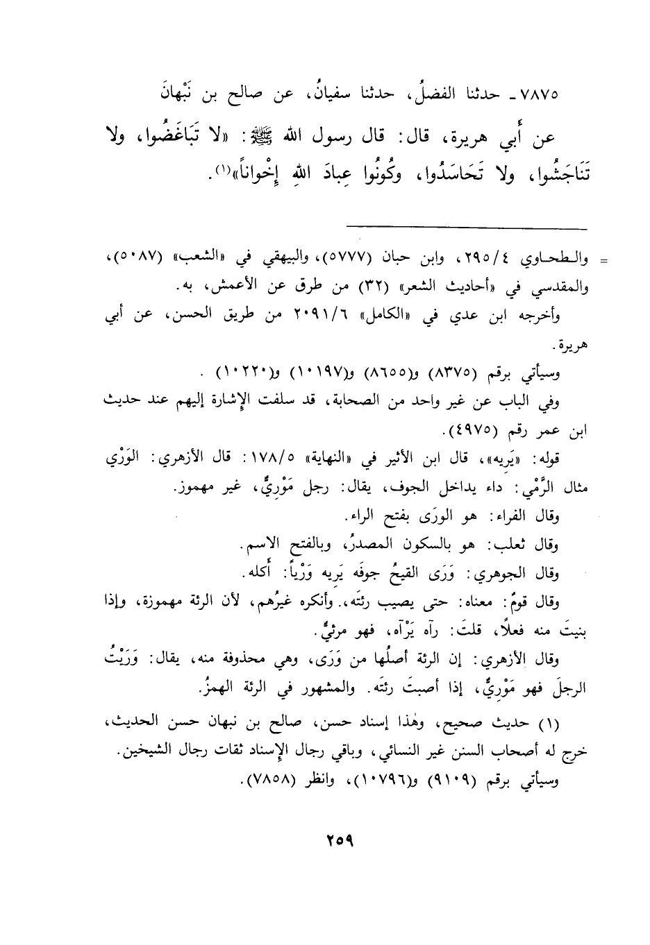 ٧٨٧٥ - حَدَّثَنَا الْفَضْلُ، حَدَّثَنَا سُفْيَانُ، عَنْ صَالِحِ بْنِ نَبْهَانَ، عَنْ أَبِي هُرَيْرَةَ، قَالَ: قَالَ رَسُولُ اللهِ صَلَّى اللهُ عَلَيْهِ وَسَلَّمَ: " لَا تَبَاغَضُوا، وَلَا تَنَاجَشُوا، وَلَا تَحَاسَدُوا، وَكُونُوا عِبَادَ اللهِ إِخْوَانًا " (١)