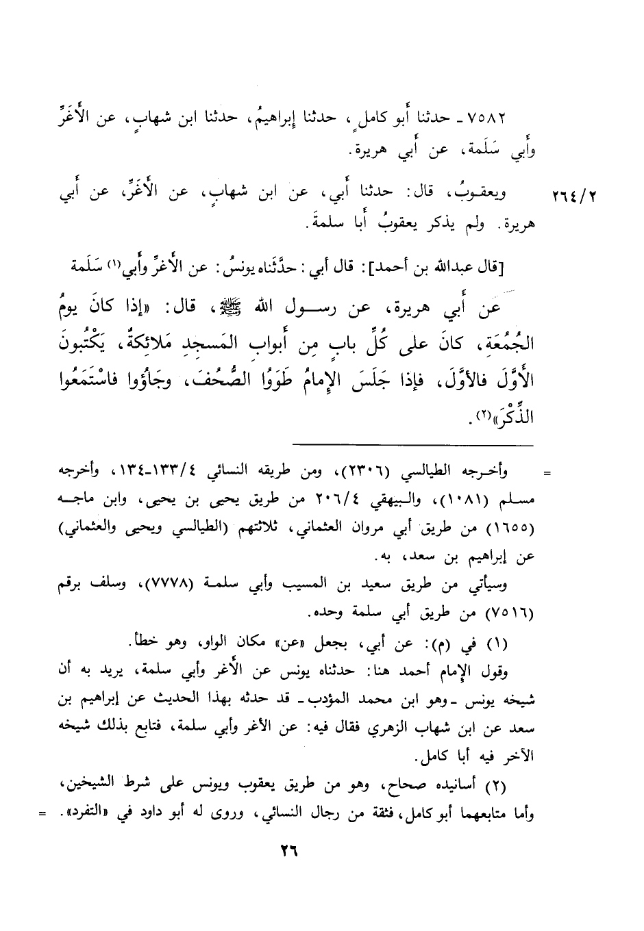 ٧٥٨٢ - حَدَّثَنَا أَبُو كَامِلٍ، حَدَّثَنَا إِبْرَاهِيمُ، حَدَّثَنَا ابْنُ شِهَابٍ، عَنِ الْأَغَرِّ، وَأَبِي سَلَمَةَ، عَنْ أَبِي هُرَيْرَةَ، وَيَعْقُوبُ، قَالَ: حَدَّثَنَا أَبِي، عَنِ ابْنِ شِهَابٍ، عَنْ أَغَرَّ، عَنْ أَبِي هُرَيْرَةَ، وَلَمْ يَذْكُرْ يَعْقُوبُ أَبَا سَلَمَةَ، [قَالَ عَبْدُ اللهِ بْنُ أَحْمَدَ] : قَالَ أَبِي: حَدَّثَنَاهُ يُونُسُ، عَنِ الْأَغَرِّ، وَأَبِي (١) سَلَمَةَ، عَنْ أَبِي هُرَيْرَةَ، عَنْ رَسُولِ اللهِ صَلَّى اللهُ عَلَيْهِ وَسَلَّمَ قَالَ: " إِذَا كَانَ يَوْمُ الْجُمُعَةِ، كَانَ عَلَى كُلِّ بَابٍ مِنْ أَبْوَابِ الْمَسْجِدِ مَلَائِكَةٌ، يَكْتُبُونَ الْأَوَّلَ فَالْأَوَّلَ، فَإِذَا جَلَسَ الْإِمَامُ طَوَوُا الصُّحُفَ، وَجَاءُوا فَاسْتَمَعُوا الذِّكْرَ " (٢)