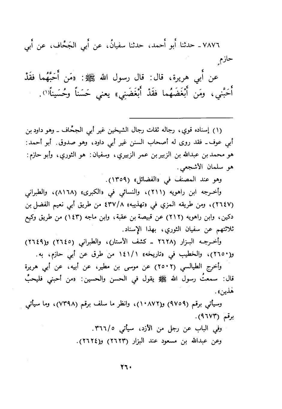 ٧٨٧٦ - حَدَّثَنَا أَبُو أَحْمَدَ، حَدَّثَنَا سُفْيَانُ، عَنْ أَبِي الْجَحَّافِ، عَنْ أَبِي حَازِمٍ، عَنْ أَبِي هُرَيْرَةَ، قَالَ: قَالَ رَسُولُ اللهِ صَلَّى اللهُ عَلَيْهِ وَسَلَّمَ: " مَنْ أَحَبَّهُمَا فَقَدْ أَحَبَّنِي، وَمَنْ أَبْغَضَهُمَا فَقَدْ أَبْغَضَنِي " يَعْنِي حَسَنًا وَحُسَيْنًا (١)