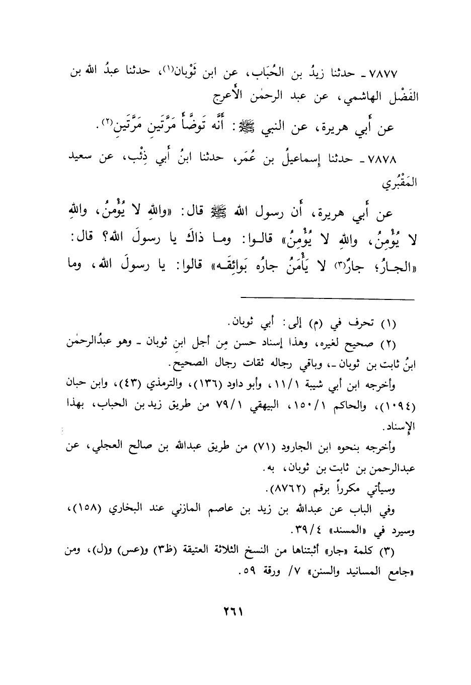 ٧٨٧٨ - حَدَّثَنَا إِسْمَاعِيلُ بْنُ عُمَرَ، حَدَّثَنَا ابْنُ أَبِي ذِئْبٍ، عَنْ سَعِيدٍ الْمَقْبُرِيِّ، عَنْ أَبِي هُرَيْرَةَ، أَنَّ رَسُولَ اللهِ صَلَّى اللهُ عَلَيْهِ وَسَلَّمَ قَالَ: " وَاللهِ لَا يُؤْمِنُ، وَاللهِ لَا يُؤْمِنُ، وَاللهِ لَا يُؤْمِنُ " قَالُوا: وَمَا ذَاكَ يَا رَسُولَ اللهِ؟ قَالَ: " الْجَارُ، جَارٌ (٣) لَا يَأْمَنُ جَارُهُ بَوَائِقَهُ " قَالُوا: يَا رَسُولَ اللهِ، وَمَا
