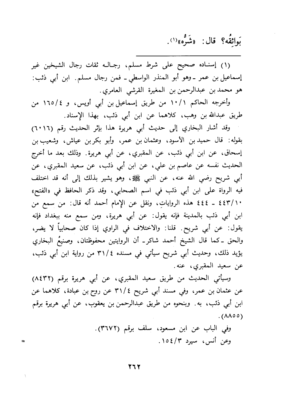 ١٠/٤٤٣-٤٤٤ هذه الرواياتِ، ونقل عن الإِمام أحمد أنه قال: من سمع من ابن أبي ذئب بالمدينة فإنه يقول: عن أبي هريرة، ومن سمع منه ببغداد فإنه يقول: عن أبي شريح. قلنا: والاختلاف في الراوي إذا كان صحابياً لا يضر، والحق -كما قال الشيخ أحمد شاكر- أن الروايتين محفوظتان، وصنيعُ البخاري يؤيد ذلك، وحديث أبي شريح سيأتي في مسنده ٤/٣١ من رواية ابن أبي ذئب،