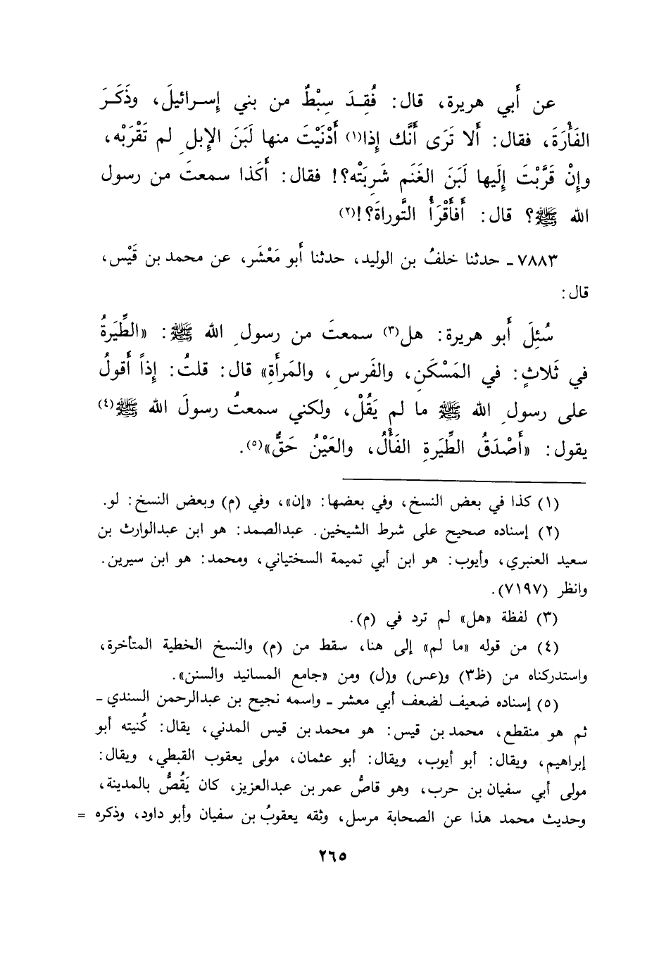 ٧٨٨٣ - حَدَّثَنَا خَلَفُ بْنُ الْوَلِيدِ، حَدَّثَنَا أَبُو مَعْشَرٍ، عَنْ مُحَمَّدِ بْنِ قَيْسٍ، قَالَ: سُئِلَ أَبُو هُرَيْرَةَ: هَلْ (٣) سَمِعْتَ مِنْ رَسُولِ اللهِ صَلَّى اللهُ عَلَيْهِ وَسَلَّمَ: " الطِّيَرَةُ فِي ثَلَاثٍ: فِي الْمَسْكَنِ، وَالْفَرَسِ، وَالْمَرْأَةِ " قَالَ: قُلْتُ: إِذَنْ أَقُولَ عَلَى رَسُولِ اللهِ صَلَّى اللهُ عَلَيْهِ وَسَلَّمَ مَا لَمْ يَقُلْ، وَلَكِنِّي سَمِعْتُ رَسُولَ اللهِ صَلَّى اللهُ عَلَيْهِ وَسَلَّمَ (٤) يَقُولُ: " أَصْدَقُ الطِّيَرَةِ الْفَأْلُ، وَالْعَيْنُ حَقٌّ " (٥)