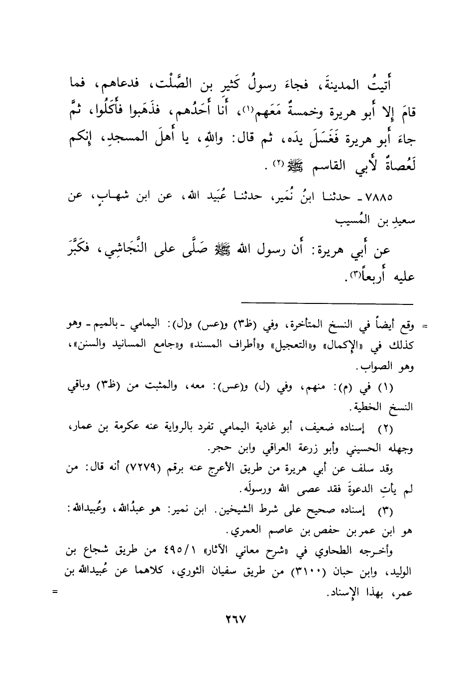 ٧٨٨٥ - حَدَّثَنَا ابْنُ نُمَيْرٍ، حَدَّثَنَا عُبَيْدُ اللهِ، عَنِ ابْنِ شِهَابٍ، عَنْ سَعِيدِ بْنِ الْمُسَيَّبِ، عَنْ أَبِي هُرَيْرَةَ: أَنَّ رَسُولَ اللهِ صَلَّى اللهُ عَلَيْهِ وَسَلَّمَ " صَلَّى عَلَى النَّجَاشِيِّ، فَكَبَّرَ عَلَيْهِ أَرْبَعًا " (٣)