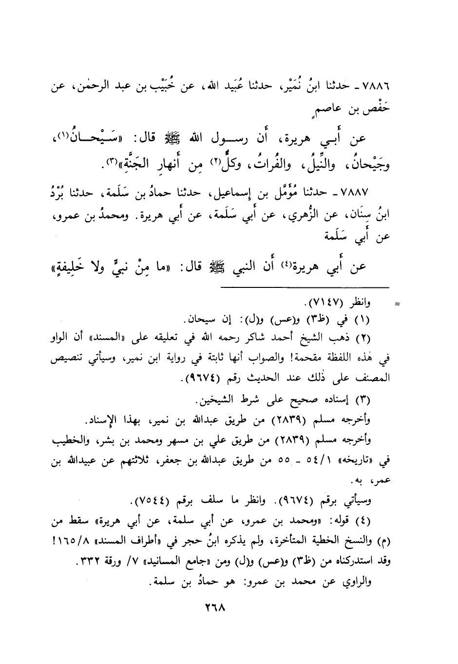 ٧٨٨٦ - حَدَّثَنَا ابْنُ نُمَيْرٍ، حَدَّثَنَا عُبَيْدُ اللهِ، عَنْ خُبَيْبِ بْنِ عَبْدِ الرَّحْمَنِ، عَنْ حَفْصِ بْنِ عَاصِمٍ، عَنْ أَبِي هُرَيْرَةَ، أَنَّ رَسُولَ اللهِ صَلَّى اللهُ عَلَيْهِ وَسَلَّمَ قَالَ: " سَيْحَانُ (١) ، وَجَيْحَانُ، وَالنِّيلُ، وَالْفُرَاتُ، كُلٌّ (٢) مِنْ أَنْهَارِ الْجَنَّةِ " (٣)