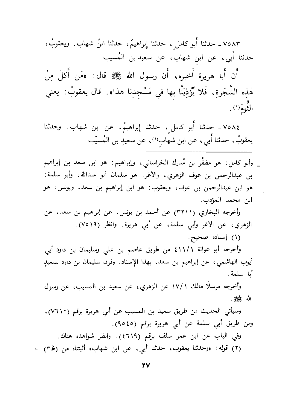 ٧٥٨٣ - حَدَّثَنَا أَبُو كَامِلٍ، حَدَّثَنَا إِبْرَاهِيمُ، حَدَّثَنَا ابْنُ شِهَابٍ، وَيَعْقُوبُ، حَدَّثَنَا أَبِي، عَنْ ابْنِ شِهَابٍ، عَنْ سَعِيدِ بْنِ الْمُسَيِّبِ، أَنَّ أَبَا هُرَيْرَةَ، أَخْبَرَهُ، أَنَّ رَسُولَ اللهِ صَلَّى اللهُ عَلَيْهِ وَسَلَّمَ قَالَ: " مَنْ أَكَلَ مِنْ هَذِهِ الشَّجَرَةِ، فَلَا يُؤْذِينَا بِهَا فِي مَسْجِدِنَا هَذَا " قَالَ يَعْقُوبُ: " يَعْنِي الثُّومَ " (١)