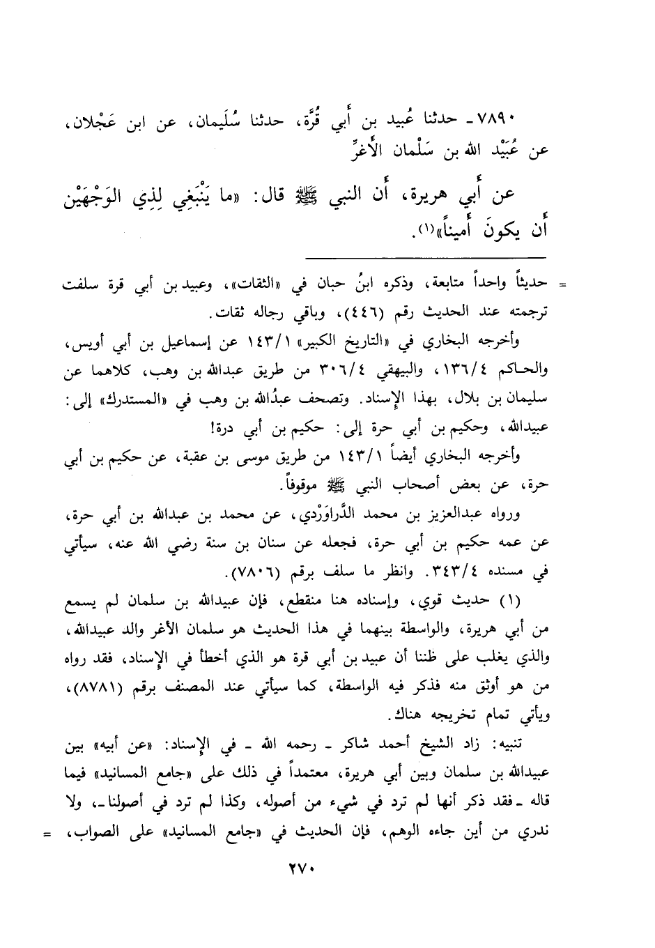 ٧٨٩٠ - حَدَّثَنَا عُبَيْدُ بْنُ أَبِي قُرَّةَ، حَدَّثَنَا سُلَيْمَانُ، عَنِ ابْنِ عَجْلَانَ، عَنْ عُبَيْدِ اللهِ بْنِ سَلْمَانَ الْأَغَرِّ، عَنْ أَبِيهِ، عَنْ أَبِي هُرَيْرَةَ، أَنَّ النَّبِيَّ صَلَّى اللهُ عَلَيْهِ وَسَلَّمَ، قَالَ: " مَا يَنْبَغِي لِذِي الْوَجْهَيْنِ أَنْ يَكُونَ أَمِينًا " (١)