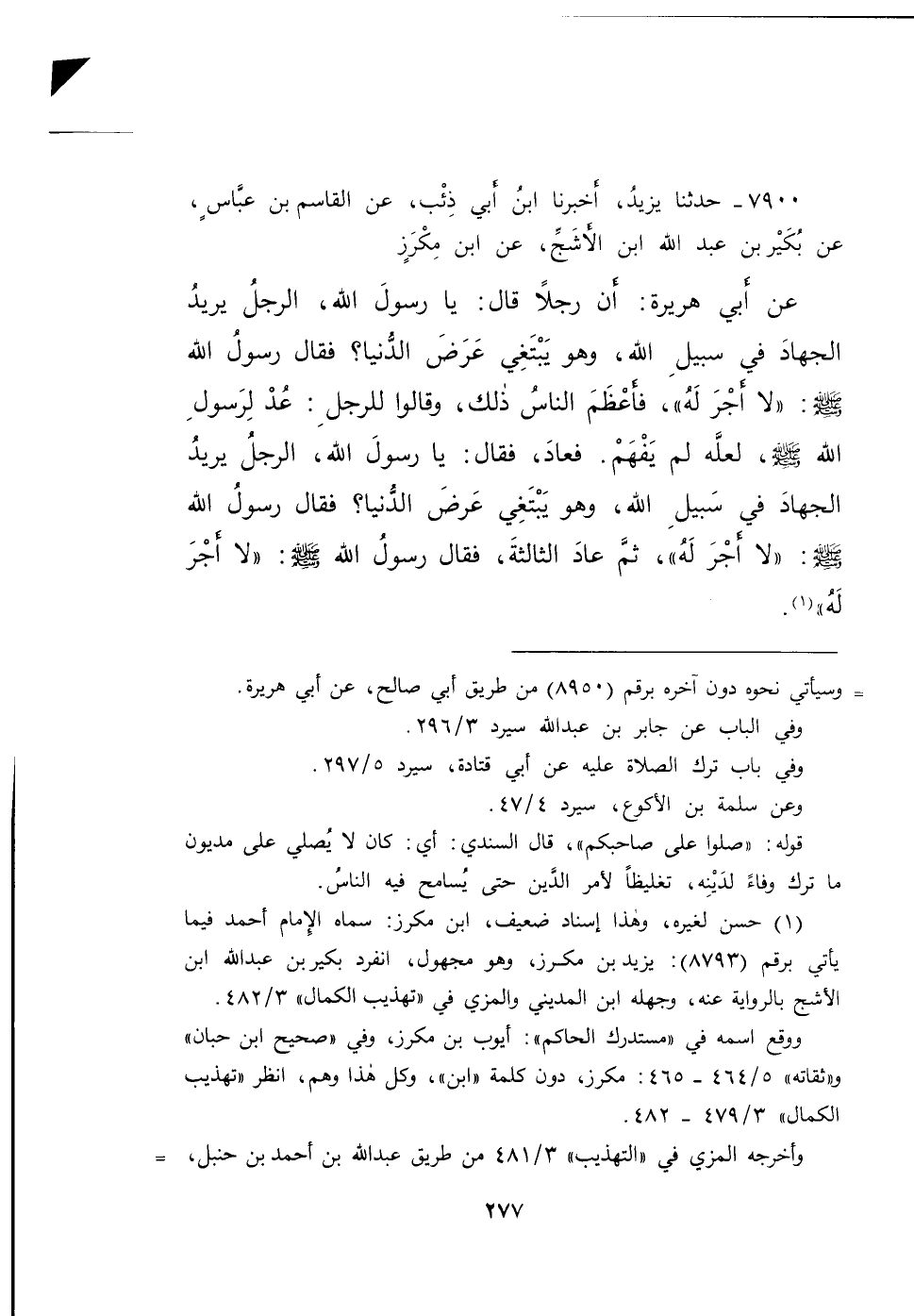 ٧٩٠٠ - حَدَّثَنَا يَزِيدُ، أَخْبَرَنَا ابْنُ أَبِي ذِئْبٍ، عَنِ الْقَاسِمِ بْنِ عَبَّاسٍ، عَنْ بُكَيْرِ بْنِ عَبْدِ اللهِ بْنِ الْأَشَجِّ، عَنِ ابْنِ مِكْرَزٍ، عَنْ أَبِي هُرَيْرَةَ: أَنَّ رَجُلًا قَالَ: يَا رَسُولَ اللهِ، الرَّجُلُ يُرِيدُ الْجِهَادَ فِي سَبِيلِ اللهِ، وَهُوَ يَبْتَغِي عَرَضَ الدُّنْيَا؟ فَقَالَ رَسُولُ اللهِ صَلَّى اللهُ عَلَيْهِ وَسَلَّمَ: " لَا أَجْرَ لَهُ "، فَأَعْظَمَ النَّاسُ ذَلِكَ، وَقَالُوا لِلرَّجُلِ: عُدْ لِرَسُولِ اللهِ صَلَّى اللهُ عَلَيْهِ وَسَلَّمَ، لَعَلَّهُ لَمْ يَفْهَمْ. فَعَادَ، فَقَالَ: يَا رَسُولَ اللهِ، الرَّجُلُ يُرِيدُ الْجِهَادَ فِي سَبِيلِ اللهِ، وَهُوَ يَبْتَغِي عَرَضَ الدُّنْيَا؟ فَقَالَ رَسُولُ اللهِ صَلَّى اللهُ عَلَيْهِ وَسَلَّمَ: " لَا أَجْرَ لَهُ "، ثُمَّ عَادَ الثَّالِثَةَ، فَقَالَ رَسُولُ اللهِ صَلَّى اللهُ عَلَيْهِ وَسَلَّمَ: " لَا أَجْرَ لَهُ " (١)