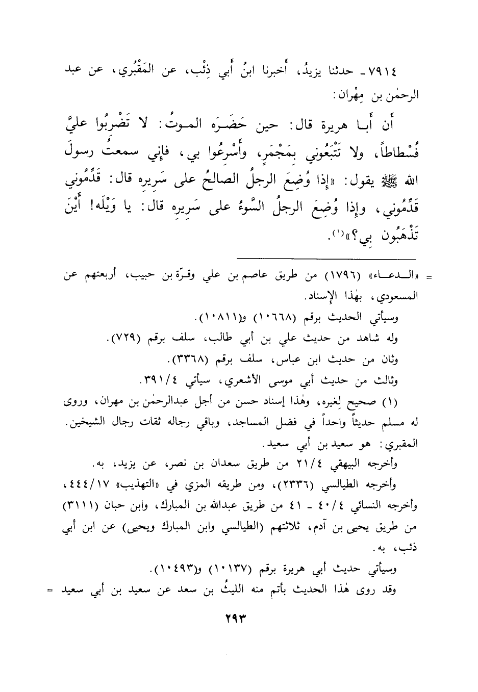 ٧٩١٤ - حَدَّثَنَا يَزِيدُ، أَخْبَرَنَا ابْنُ أَبِي ذِئْبٍ، عَنِ الْمَقْبُرِيِّ، عَنْ عَبْدِ الرَّحْمَنِ بْنِ مِهْرَانَ، أَنَّ أَبَا هُرَيْرَةَ، قَالَ: حِينَ حَضَرَهُ الْمَوْتُ: لَا تَضْرِبُوا عَلَيَّ فُسْطَاطًا، وَلَا تَتْبَعُونِي بِمِجْمَرٍ، وَأَسْرِعُوا بِي، فَإِنِّي سَمِعْتُ رَسُولَ اللهِ صَلَّى اللهُ عَلَيْهِ وَسَلَّمَ يَقُولُ: " إِذَا وُضِعَ الرَّجُلُ الصَّالِحُ عَلَى سَرِيرِهِ قَالَ: قَدِّمُونِي قَدِّمُونِي، وَإِذَا وُضِعَ الرَّجُلُ السُّوءُ عَلَى سَرِيرِهِ قَالَ: يَا وَيْلَهُ أَيْنَ تَذْهَبُونَ بِي؟ " (١)