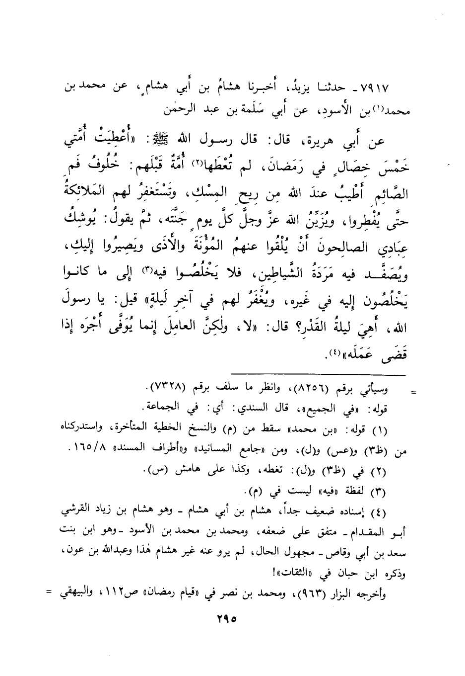 ٧٩١٧ - حَدَّثَنَا يَزِيدُ، أَخْبَرَنَا هِشَامُ بْنُ أَبِي هِشَامٍ، عَنْ مُحَمَّدِ (١) بْنِ الْأَسْوَدِ، عَنْ أَبِي سَلَمَةَ بْنِ عَبْدِ الرَّحْمَنِ، عَنْ أَبِي هُرَيْرَةَ، قَالَ: قَالَ رَسُولُ اللهِ صَلَّى اللهُ عَلَيْهِ وَسَلَّمَ: " أُعْطِيَتْ أُمَّتِي خَمْسَ خِصَالٍ فِي رَمَضَانَ، لَمْ تُعْطَهَا (٢) أُمَّةٌ قَبْلَهُمْ: خُلُوفُ فَمِ الصَّائِمِ أَطْيَبُ عِنْدَ اللهِ مِنْ رِيحِ الْمِسْكِ، وَتَسْتَغْفِرُ لَهُمُ الْمَلَائِكَةُ حَتَّى يُفْطِرُوا، وَيُزَيِّنُ اللهُ عَزَّ وَجَلَّ كُلَّ يَوْمٍ جَنَّتَهُ، ثُمَّ يَقُولُ: يُوشِكُ عِبَادِي الصَّالِحُونَ أَنْ يُلْقُوا عَنْهُمُ الْمَئُونَةَ وَالْأَذَى وَيَصِيرُوا إِلَيْكِ، وَيُصَفَّدُ فِيهِ مَرَدَةُ الشَّيَاطِينِ، فَلَا يَخْلُصُوا فِيهِ (٣) إِلَى مَا كَانُوا يَخْلُصُونَ إِلَيْهِ فِي غَيْرِهِ، وَيُغْفَرُ لَهُمْ فِي آخِرِ لَيْلَةٍ " قِيلَ: يَا رَسُولَ اللهِ، أَهِيَ لَيْلَةُ الْقَدْرِ؟ قَالَ: " لَا، وَلَكِنَّ الْعَامِلَ إِنَّمَا يُوَفَّى أَجْرَهُ إِذَا قَضَى عَمَلَهُ " (٤)
