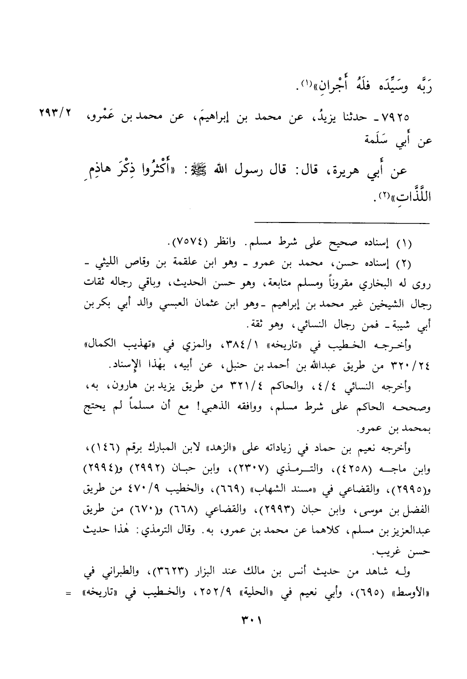 ٧٩٢٥ - حَدَّثَنَا يَزِيدُ، عَنْ مُحَمَّدِ بْنِ إِبْرَاهِيمَ، عَنْ مُحَمَّدِ بْنِ عَمْرٍو، عَنْ أَبِي سَلَمَةَ، عَنْ أَبِي هُرَيْرَةَ، قَالَ: قَالَ رَسُولُ اللهِ صَلَّى اللهُ عَلَيْهِ وَسَلَّمَ: " أَكْثِرُوا ذِكْرَ هَاذِمِ اللَّذَّاتِ " (٢)