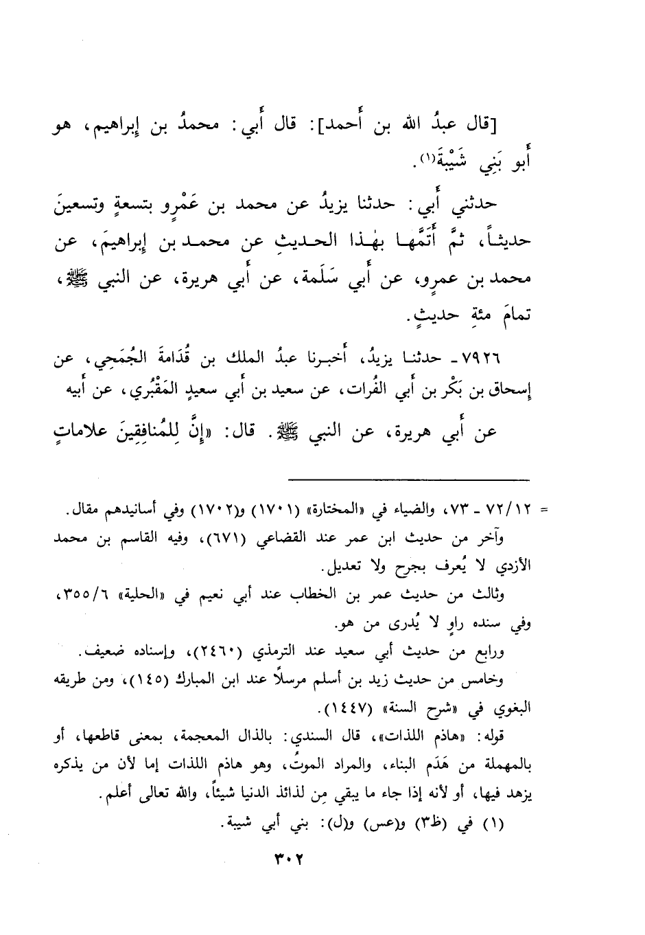 قَالَ عَبْدُ اللهِ بْنُ أَحْمَدَ: قَالَ أَبِي: مُحَمَّدُ بْنُ إِبْرَاهِيمَ هُوَ أَبُو بَنِي شَيْبَةَ " (١) حَدَّثَنِي أَبِي: حَدَّثَنَا يَزِيدُ، عَنْ مُحَمَّدِ بْنِ عَمْرٍو - بِتِسْعَةٍ وَتِسْعِينَ حَدِيثًا، ثُمَّ أَتَمَّهَا بِهَذَا الْحَدِيثِ -. عَنْ مُحَمَّدِ بْنِ إِبْرَاهِيمَ، عَنْ مُحَمَّدِ بْنِ عَمْرٍو، عَنْ أَبِي سَلَمَةَ، عَنْ أَبِي هُرَيْرَةَ، عَنِ النَّبِيِّ صَلَّى اللهُ عَلَيْهِ وَسَلَّمَ، تَمَامَ مِائَةِ حَدِيثٍ
