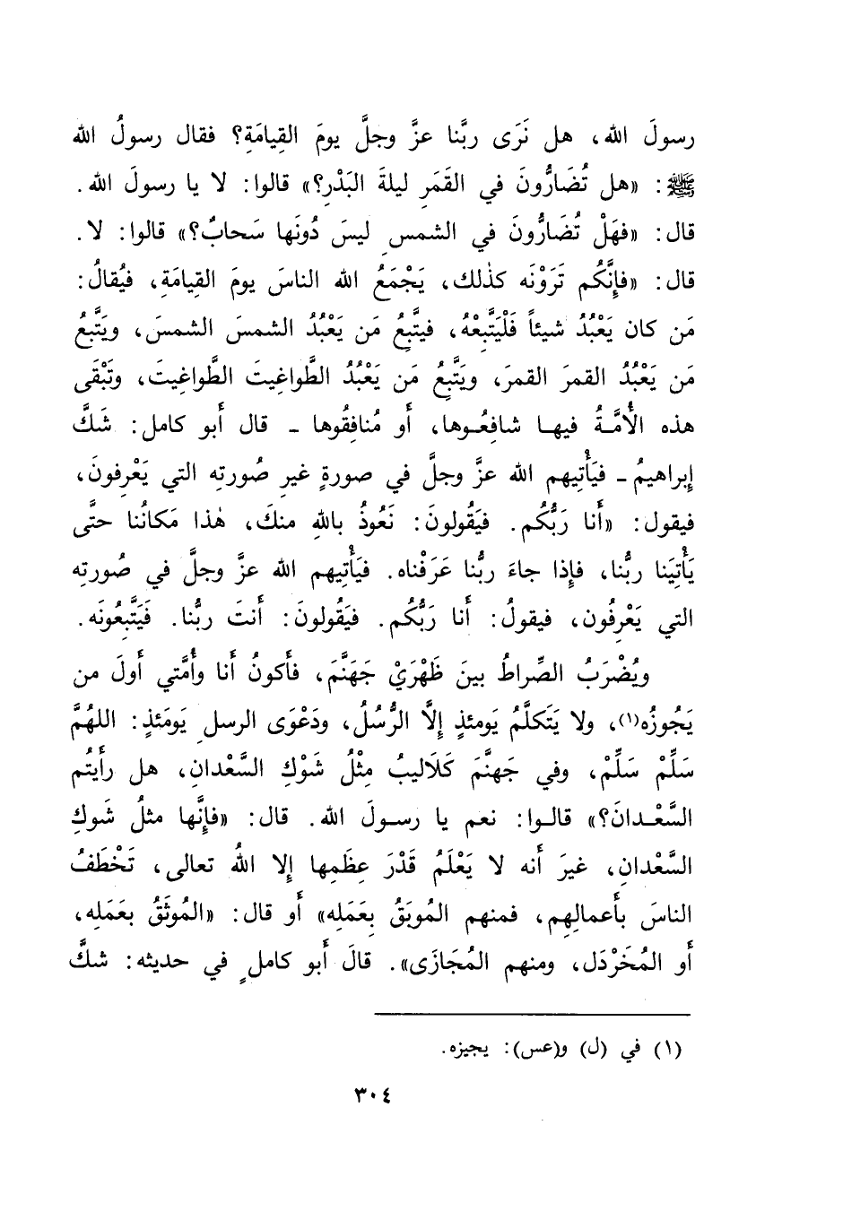 رَسُولَ اللهِ، هَلْ نَرَى رَبَّنَا عَزَّ وَجَلَّ يَوْمَ الْقِيَامَةِ؟ فَقَالَ رَسُولُ اللهِ صَلَّى اللهُ عَلَيْهِ وَسَلَّمَ: " هَلْ تُضَارُّونَ فِي الْقَمَرِ لَيْلَةَ الْبَدْرِ؟ " قَالُوا: لَا يَا رَسُولَ اللهِ. قَالَ: " فَهَلْ تُضَارُّونَ فِي الشَّمْسِ لَيْسَ دُونَهَا سَحَابٌ؟ " قَالُوا: لَا. قَالَ: " فَإِنَّكُمْ تَرَوْنَهُ كَذَلِكَ، يَجْمَعُ اللهُ النَّاسَ يَوْمَ الْقِيَامَةِ، فَيُقَالُ: مَنْ كَانَ يَعْبُدُ شَيْئًا فَلْيَتَّبِعْهُ، فَيَتْبَعُ مَنْ يَعْبُدُ الشَّمْسَ الشَّمْسَ، وَيَتْبَعُ مَنْ يَعْبُدُ الْقَمَرَ الْقَمَرَ، وَيَتْبَعُ مَنْ يَعْبُدُ الطَّوَاغِيتَ الطَّوَاغِيتَ، وَتَبْقَى هَذِهِ الْأُمَّةُ فِيهَا شَافِعُوهَا، أَوْ مُنَافِقُوهَا - قَالَ أَبُو كَامِلٍ: شَكَّ إِبْرَاهِيمُ - فَيَأْتِيهِمُ اللهُ عَزَّ وَجَلَّ فِي صُورَةٍ غَيْرِ صُورَتِهِ الَّتِي يَعْرِفُونَ، فَيَقُولُ: أَنَا رَبُّكُمْ. فَيَقُولُونَ: نَعُوذُ بِاللهِ مِنْكَ، هَذَا مَكَانُنَا حَتَّى يَأْتِيَنَا رَبُّنَا، فَإِذَا جَاءَ رَبُّنَا عَرَفْنَاهُ. فَيَأْتِيهِمُ اللهُ عَزَّ وَجَلَّ فِي صُورَتِهِ الَّتِي يَعْرِفُونَ، فَيَقُولُ: أَنَا رَبُّكُمْ. فَيَقُولُونَ: أَنْتَ رَبُّنَا. فَيَتَّبِعُونَهُ. وَيُضْرَبُ الصِّرَاطُ بَيْنَ ظَهْرَيْ جَهَنَّمَ، فَأَكُونُ أَنَا وَأُمَّتِي أَوَّلَ مَنْ يَجُوزُه، (١) وَلَا يَتَكَلَّمُ يَوْمَئِذٍ إِلَّا الرُّسُلُ، وَدَعْوَى الرُّسُلِ يَوْمَئِذٍ: اللهُمَّ سَلِّمْ سَلِّمْ، وَفِي جَهَنَّمَ كَلَالِيبُ مِثْلُ شَوْكِ السَّعْدَانِ، هَلْ رَأَيْتُمُ السَّعْدَانَ؟ " قَالُوا: نَعَمْ يَا رَسُولَ اللهِ. قَالَ: " فَإِنَّهَا مِثْلُ شَوْكِ السَّعْدَانِ، غَيْرَ أَنَّهُ لَا يَعْلَمُ قَدْرَ عِظَمِهَا إِلَّا اللهُ تَعَالَى، تَخْطَفُ النَّاسَ بِأَعْمَالِهِمْ، فَمِنْهُمُ الْمُوبَقُ بِعَمَلِهِ - أَوْ قَالَ: الْمُوثَقُ بِعَمَلِهِ أَوِ الْمُخَرْدَلُ -، وَمِنْهُمُ الْمُجَازَى - قَالَ أَبُو كَامِلٍ فِي حَدِيثِهِ: شَكَّ
