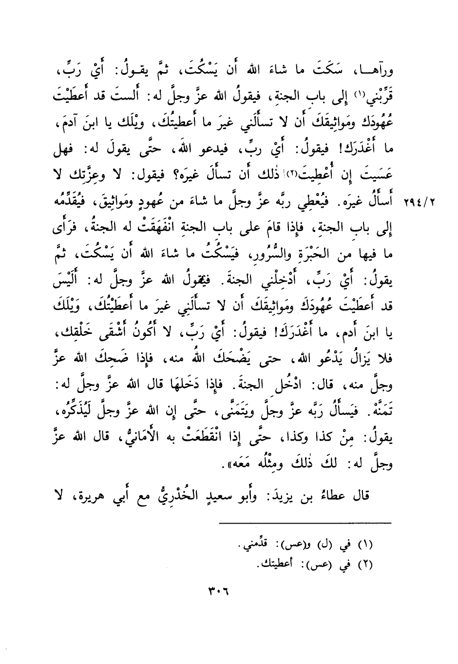 وَرَآهَا، سَكَتَ مَا شَاءَ اللهُ أَنْ يَسْكُتَ، ثُمَّ يَقُولُ: أَيْ رَبِّ، قَرِّبْنِي (١) إِلَى بَابِ الْجَنَّةِ، فَيَقُولُ اللهُ عَزَّ وَجَلَّ لَهُ: أَلَسْتَ قَدْ أَعْطَيْتَ عُهُودَكَ وَمَوَاثِيقَكَ أَنْ لَا تَسْأَلَنِي غَيْرَ مَا أَعْطَيْتُكَ، وَيْلَكَ يَا ابْنَ آدَمَ، مَا أَغْدَرَكَ فَيَقُولُ: أَيْ رَبِّ، فَيَدْعُو اللهَ، حَتَّى يَقُولَ لَهُ: فَهَلْ عَسَيْتَ إِنْ أُعْطِيتَ (٢) ذَلِكَ أَنْ تَسْأَلَ غَيْرَهُ؟ فَيَقُولُ: لَا وَعِزَّتِكَ لَا أَسْأَلُ غَيْرَهُ. فَيُعْطِي رَبَّهُ عَزَّ وَجَلَّ مَا شَاءَ مِنْ عُهُودٍ وَمَوَاثِيقَ، فَيُقَدِّمُهُ إِلَى بَابِ الْجَنَّةِ، فَإِذَا قَامَ عَلَى بَابِ الْجَنَّةِ انْفَهَقَتْ لَهُ الْجَنَّةُ، فَرَأَى مَا فِيهَا مِنَ الْحَبْرَةِ وَالسُّرُورِ، فَيَسْكُتُ مَا شَاءَ اللهُ أَنْ يَسْكُتَ، ثُمَّ يَقُولُ: أَيْ رَبِّ، أَدْخِلْنِي الْجَنَّةَ. فَيَقُولُ اللهُ عَزَّ وَجَلَّ لَهُ: أَلَيْسَ قَدْ أَعْطَيْتَ عُهُودَكَ وَمَوَاثِيقَكَ أَنْ لَا تَسْأَلَنِي غَيْرَ مَا أَعْطَيْتُكَ، وَيْلَكَ يَا ابْنَ آدَمَ، مَا أَغْدَرَكَ فَيَقُولُ: أَيْ رَبِّ، لَا أَكُونُ أَشْقَى خَلْقِكَ، فَلَا يَزَالُ يَدْعُو اللهَ، حَتَّى يَضْحَكَ اللهُ مِنْهُ، فَإِذَا ضَحِكَ اللهُ عَزَّ وَجَلَّ مِنْهُ، قَالَ: ادْخُلِ الْجَنَّةَ. فَإِذَا دَخَلَهَا قَالَ اللهُ عَزَّ وَجَلَّ لَهُ: تَمَنَّهْ. فَيَسْأَلُ رَبَّهُ عَزَّ وَجَلَّ وَيَتَمَنَّى، حَتَّى إِنَّ اللهَ عَزَّ وَجَلَّ لَيُذَكِّرُهُ، يَقُولُ: مِنْ كَذَا وَكَذَا، حَتَّى إِذَا انْقَطَعَتْ بِهِ الْأَمَانِيُّ، قَالَ اللهُ عَزَّ وَجَلَّ لَهُ: لَكَ ذَلِكَ وَمِثْلُهُ مَعَهُ " قَالَ عَطَاءُ بْنُ يَزِيدَ: وَأَبُو سَعِيدٍ الْخُدْرِيُّ مَعَ أَبِي هُرَيْرَةَ، لَا