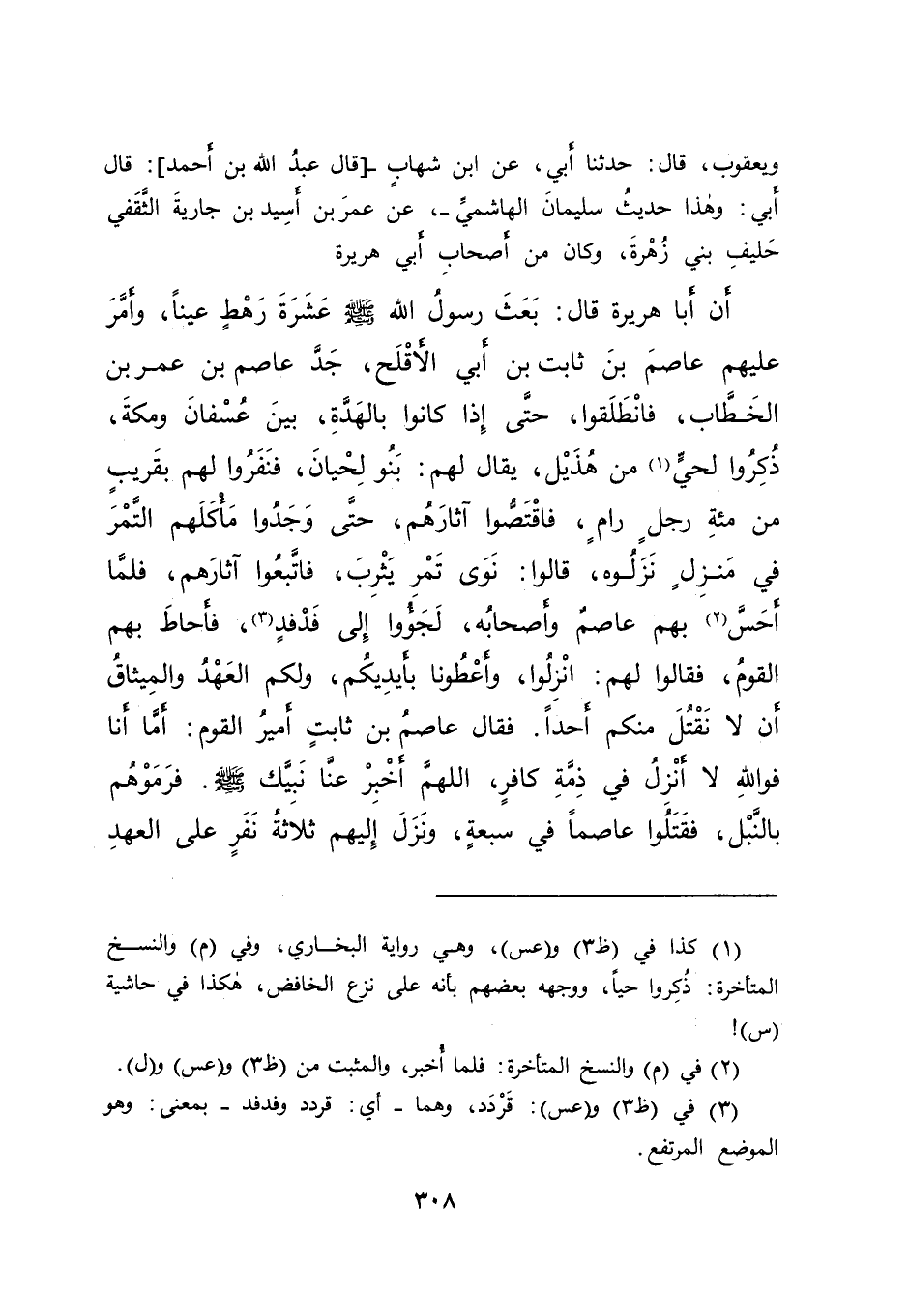 وَيَعْقُوبُ، قَالَ: حَدَّثَنَا أَبِي، عَنِ ابْنِ شِهَابٍ، قَالَ عَبْدُ اللهِ بْنُ أَحْمَدَ: قَالَ أَبِي: " وَهَذَا حَدِيثُ سُلَيْمَانَ الْهَاشِمِيِّ "، عَنْ عَمْرِو بْنِ أَسِيدِ بْنِ جَارِيَةَ الثَّقَفِيِّ، حَلِيفِ بَنِي زُهْرَةَ، وَكَانَ مِنْ أَصْحَابِ أَبِي هُرَيْرَةَ، أَنَّ أَبَا هُرَيْرَةَ، قَالَ: " بَعَثَ رَسُولُ اللهِ صَلَّى اللهُ عَلَيْهِ وَسَلَّمَ عَشَرَةَ رَهْطٍ عَيْنًا، وَأَمَّرَ عَلَيْهِمْ عَاصِمَ بْنَ ثَابِتِ بْنِ أَبِي الْأَقْلَحِ جَدَّ عَاصِمِ بْنِ عُمَرَ بْنِ الْخَطَّابِ "، فَانْطَلَقُوا، حَتَّى إِذَا كَانُوا بِالْهَدَّةِ، بَيْنَ عُسْفَانَ وَمَكَّةَ، ذُكِرُوا لِحَيٍّ (١) مِنْ هُذَيْلٍ يُقَالُ لَهُمْ: بَنُو لِحْيَانَ، فَنَفَرُوا لَهُمْ بِقَرِيبٍ مِنْ مِائَةِ رَجُلٍ رَامٍ، فَاقْتَصُّوا آثَارَهُمْ، حَتَّى وَجَدُوا مَأْكَلَهُمُ التَّمْرَ فِي مَنْزِلٍ نَزَلُوهُ، قَالُوا: نَوَى تَمْرِ يَثْرِبَ، فَاتَّبَعُوا آثَارَهُمْ، فَلَمَّا أَحَسَّ (٢) بِهِمْ عَاصِمٌ وَأَصْحَابُهُ، لَجَئُوا إِلَى فَدْفَدٍ (٣) ، فَأَحَاطَ بِهِمُ الْقَوْمُ، فَقَالُوا لَهُمْ: انْزِلُوا، وَأَعْطُونَا بِأَيْدِيكُمْ، وَلَكُمُ الْعَهْدُ وَالْمِيثَاقُ أَنْ لَا نَقْتُلَ مِنْكُمْ أَحَدًا. فَقَالَ عَاصِمُ بْنُ ثَابِتٍ أَمِيرُ الْقَوْمِ: أَمَّا أَنَا فَاللهِ لَا أَنْزِلُ فِي ذِمَّةِ كَافِرٍ، اللهُمَّ أَخْبِرْ عَنَّا نَبِيَّكَ صَلَّى اللهُ عَلَيْهِ وَسَلَّمَ. فَرَمَوْهُمْ بِالنَّبْلِ، فَقَتَلُوا عَاصِمًا فِي سَبْعَةٍ، وَنَزَلَ إِلَيْهِمْ ثَلَاثَةُ نَفَرٍ عَلَى الْعَهْدِ