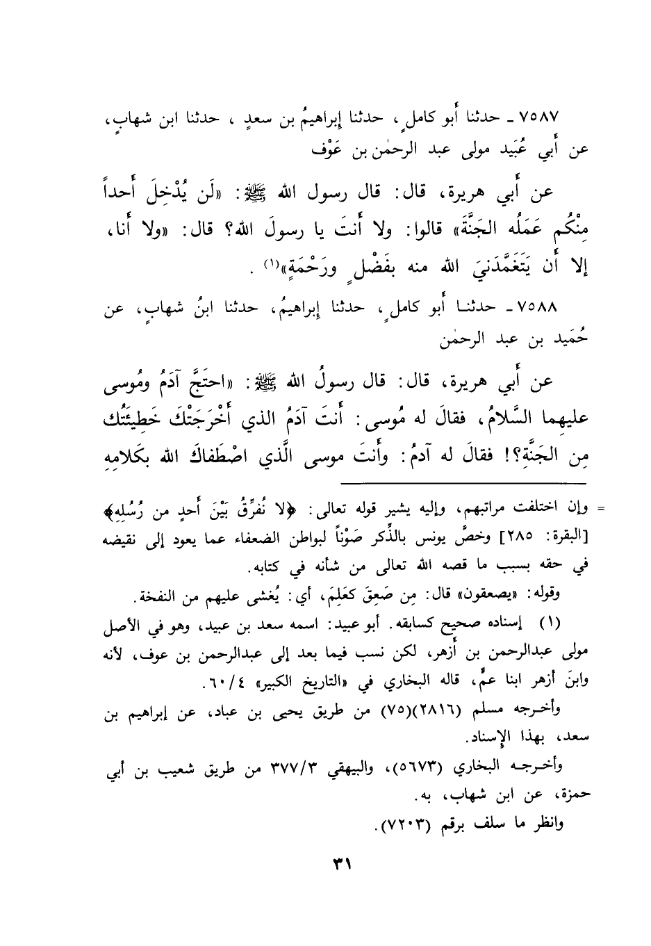 ٧٥٨٧ - حَدَّثَنَا أَبُو كَامِلٍ، حَدَّثَنَا إِبْرَاهِيمُ بْنُ سَعْدٍ، حَدَّثَنَا ابْنُ شِهَابٍ، عَنْ أَبِي عُبَيْدٍ، مَوْلَى عَبْدِ الرَّحْمَنِ بْنِ عَوْفٍ، عَنْ أَبِي هُرَيْرَةَ، قَالَ: قَالَ رَسُولُ اللهِ صَلَّى اللهُ عَلَيْهِ وَسَلَّمَ: " لَنْ يُدْخِلَ أَحَدًا مِنْكُمْ عَمَلُهُ الْجَنَّةَ " قَالُوا: وَلَا أَنْتَ يَا رَسُولَ اللهِ؟ قَالَ: " وَلَا أَنَا، إِلَّا أَنْ يَتَغَمَّدَنِي اللهُ مِنْهُ بِفَضْلٍ وَرَحْمَةٍ " (١)