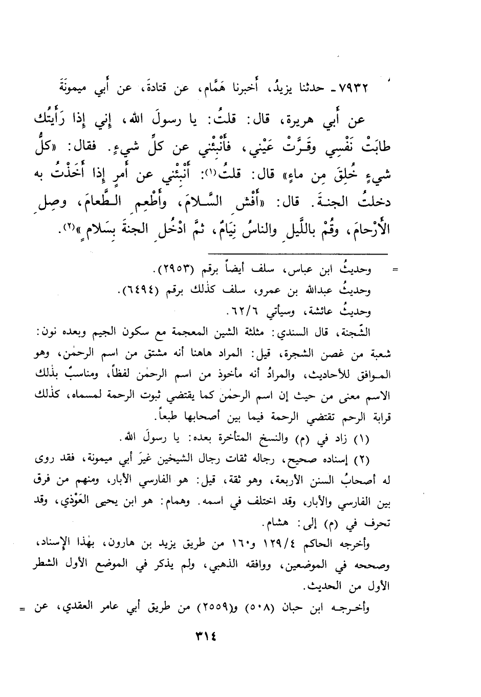 ٧٩٣٢ - حَدَّثَنَا يَزِيدُ، أَخْبَرَنَا هَمَّامٌ، عَنْ قَتَادَةَ، عَنْ أَبِي مَيْمُونَةَ، عَنْ أَبِي هُرَيْرَةَ، قَالَ: قُلْتُ: يَا رَسُولَ اللهِ، إِنِّي إِذَا رَأَيْتُكَ طَابَتْ نَفْسِي وَقَرَّتْ عَيْنِي، فَأَنْبِئْنِي عَنْ كُلِّ شَيْءٍ. فَقَالَ: " كُلُّ شَيْءٍ خُلِقَ مِنْ مَاءٍ " قَالَ: قُلْتُ (١) : أَنْبِئْنِي عَنْ أَمْرٍ إِذَا أَخَذْتُ بِهِ دَخَلْتُ الْجَنَّةَ. قَالَ: " أَفْشِ السَّلَامَ، وَأَطْعِمِ الطَّعَامَ، وَصِلِ الْأَرْحَامَ، وَقُمْ بِاللَّيْلِ وَالنَّاسُ نِيَامٌ، ثُمَّ ادْخُلِ الْجَنَّةَ بِسَلَامٍ " (٢)