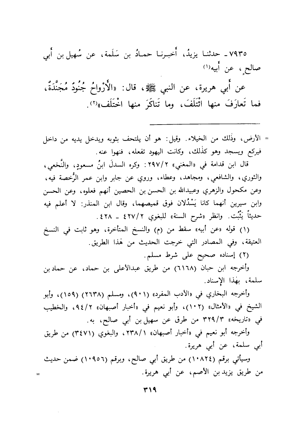 ٧٩٣٥ - حَدَّثَنَا يَزِيدُ، أَخْبَرَنَا حَمَّادُ بْنُ سَلَمَةَ، عَنْ سُهَيْلِ بْنِ أَبِي صَالِحٍ، عَنْ أَبِيهِ (١) ، عَنْ أَبِي هُرَيْرَةَ، عَنِ النَّبِيِّ صَلَّى اللهُ عَلَيْهِ وَسَلَّمَ قَالَ: " الْأَرْوَاحُ جُنُودٌ مُجَنَّدَةٌ، فَمَا تَعَارَفَ مِنْهَا ائْتَلَفَ، وَمَا تَنَاكَرَ مِنْهَا اخْتَلَفَ " (٢)