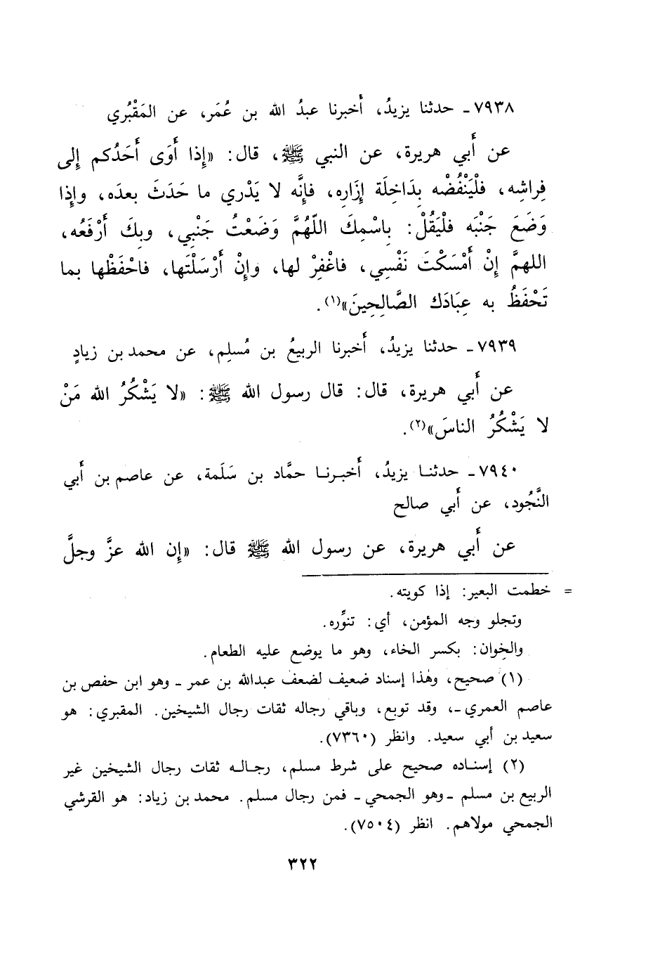 ٧٩٣٩ - حَدَّثَنَا يَزِيدُ، أَخْبَرَنَا الرَّبِيعُ بْنُ مُسْلِمٍ، عَنْ مُحَمَّدِ بْنِ زِيَادٍ، عَنْ أَبِي هُرَيْرَةَ، قَالَ: قَالَ رَسُولُ اللهِ صَلَّى اللهُ عَلَيْهِ وَسَلَّمَ: " لَا يَشْكُرُ اللهَ مَنْ لَا يَشْكُرُ النَّاسَ " (٢)