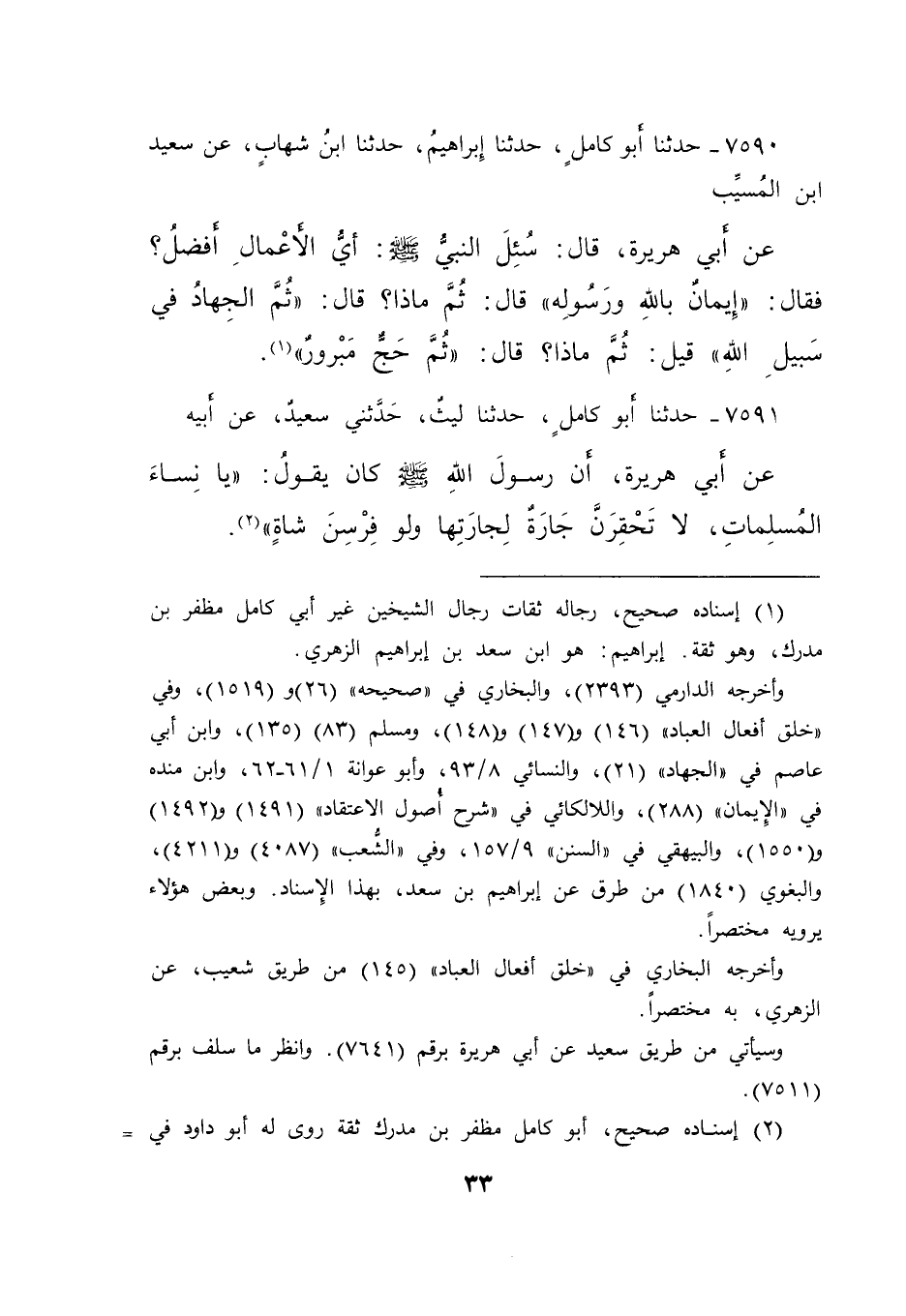 ٧٥٩٠ - حَدَّثَنَا أَبُو كَامِلٍ، حَدَّثَنَا إِبْرَاهِيمُ، حَدَّثَنَا ابْنُ شِهَابٍ، عَنْ سَعِيدِ بْنِ الْمُسَيِّبِ، عَنْ أَبِي هُرَيْرَةَ، قَالَ سُئِلَ النَّبِيُّ صَلَّى اللهُ عَلَيْهِ وَسَلَّمَ: أَيُّ الْأَعْمَالِ أَفْضَلُ؟ فَقَالَ: " إِيمَانٌ بِاللهِ وَرَسُولِهِ " قَالَ: ثُمَّ مَاذَا؟ قَالَ: " ثُمَّ الْجِهَادُ فِي سَبِيلِ اللهِ " قِيلَ: ثُمَّ مَاذَا؟ قَالَ: " ثُمَّ حَجٌّ مَبْرُورٌ " (١)