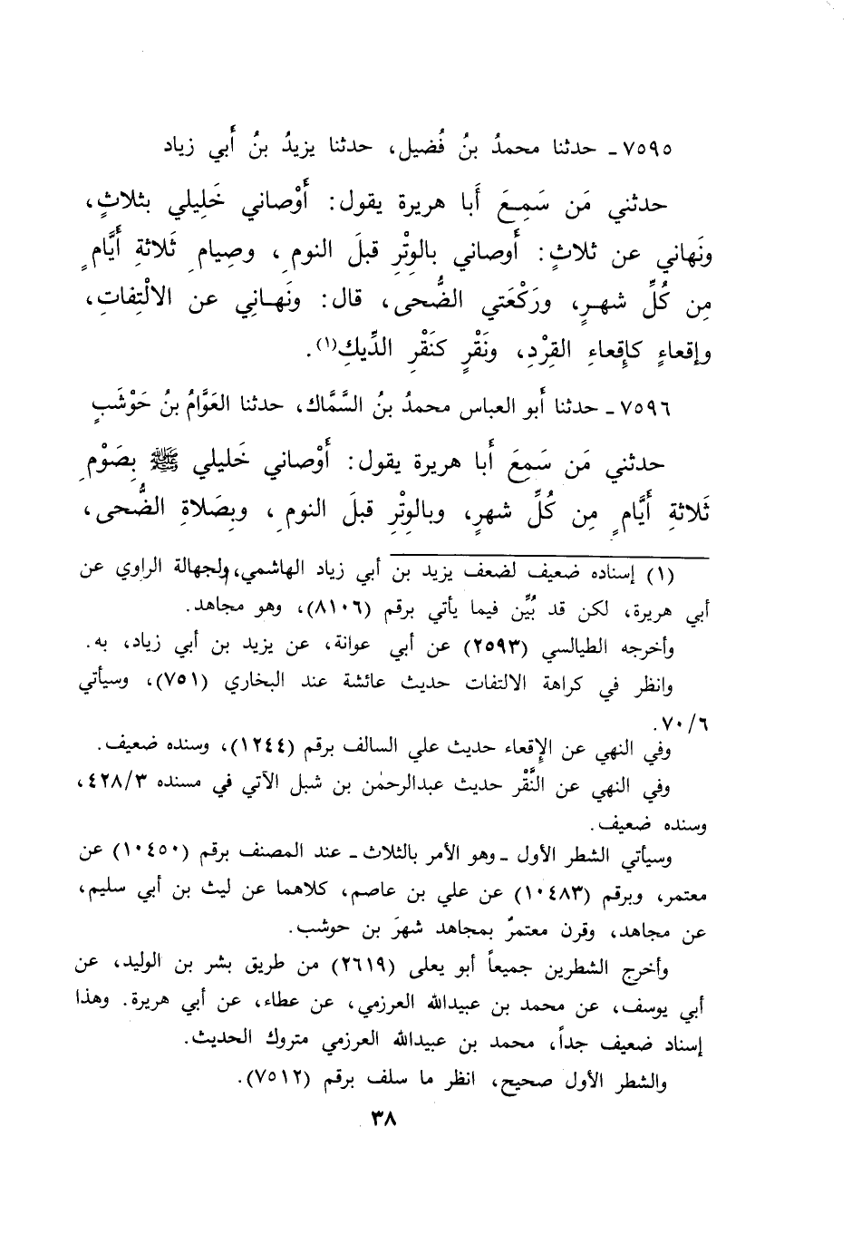 ٧٥٩٥ - حَدَّثَنَا مُحَمَّدُ بْنُ فُضَيْلٍ، حَدَّثَنَا يَزِيدُ بْنُ أَبِي زِيَادٍ، حَدَّثَنِي مَنْ، سَمِعَ أَبَا هُرَيْرَةَ، يَقُولُ: أَوْصَانِي خَلِيلِي بِثَلَاثٍ، وَنَهَانِي عَنْ ثَلَاثٍ: " أَوْصَانِي بِالْوِتْرِ قَبْلَ النَّوْمِ، وَصِيَامِ ثَلَاثَةِ أَيَّامٍ مِنْ كُلِّ شَهْرٍ، وَرَكْعَتَيِ الضُّحَى "، قَالَ: " وَنَهَانِي عَنِ الِالْتِفَاتِ، وَإِقْعَاءٍ كَإِقْعَاءِ الْقِرْدِ، وَنَقْرٍ كَنَقْرِ الدِّيكِ " (١)