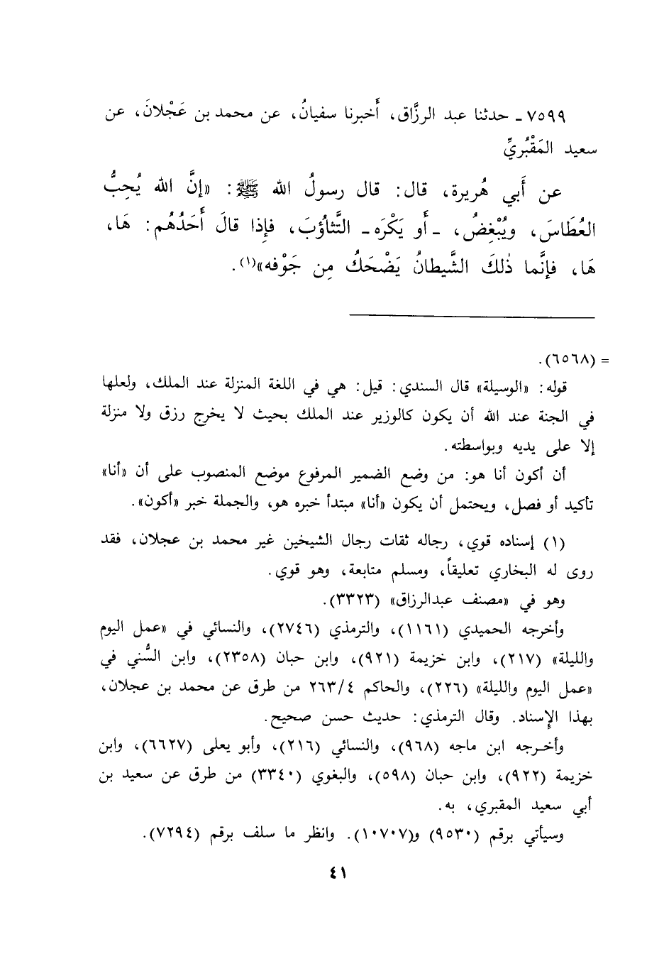 ٧٥٩٩ - حَدَّثَنَا عَبْدُ الرَّزَّاقِ، أَخْبَرَنَا سُفْيَانُ، عَنْ مُحَمَّدِ بْنِ عَجْلَانَ، عَنْ سَعِيدٍ الْمَقْبُرِيِّ، عَنْ أَبِي هُرَيْرَةَ، قَالَ: قَالَ رَسُولُ اللهِ صَلَّى اللهُ عَلَيْهِ وَسَلَّمَ: " إِنَّ اللهَ يُحِبُّ الْعُطَاسَ، وَيُبْغِضُ أَوْ يَكْرَهُ التَّثَاؤُبَ، فَإِذَا قَالَ أَحَدُهُمْ: هَا، هَا، فَإِنَّمَا ذَلِكَ الشَّيْطَانُ يَضْحَكُ مِنْ جَوْفِهِ " (١)
