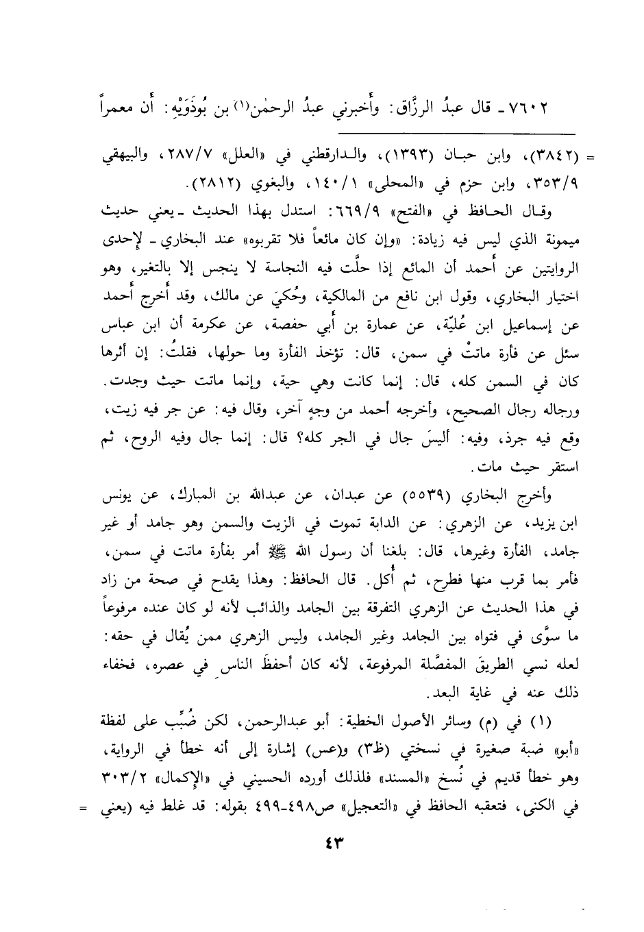 وأخرج البخاري (٥٥٣٩) عن عبدان، عن عبد الله بن المبارك، عن يونس ابن يزيد، عن الزهري: عن الدابة تموت في الزيت والسمن وهو جامد أو غير جامد، الفأرة وغيرها، قال: بلغنا أن رسول الله صَلَّى اللهُ عَلَيْهِ وَسَلَّمَ أمر بفأرة ماتت في سمن، فأمر بما قرب منها فطرح، ثم أكل. قال الحافظ: وهذا يقدح في صحة من زاد في هذا الحديث عن الزهري التفرقة بين الجامد والذائب لأنه لو كان عنده مرفوعاً ما سوى في فتواه بين الجامد وغير الجامد، وليس الزهري ممن يُقال في حقه: لعله نسي الطريقَ المفصَّلة المرفوعة، لأنه كان أحفظَ الناسِ في عصره، فخفاء ذلك عنه في غاية البعد.