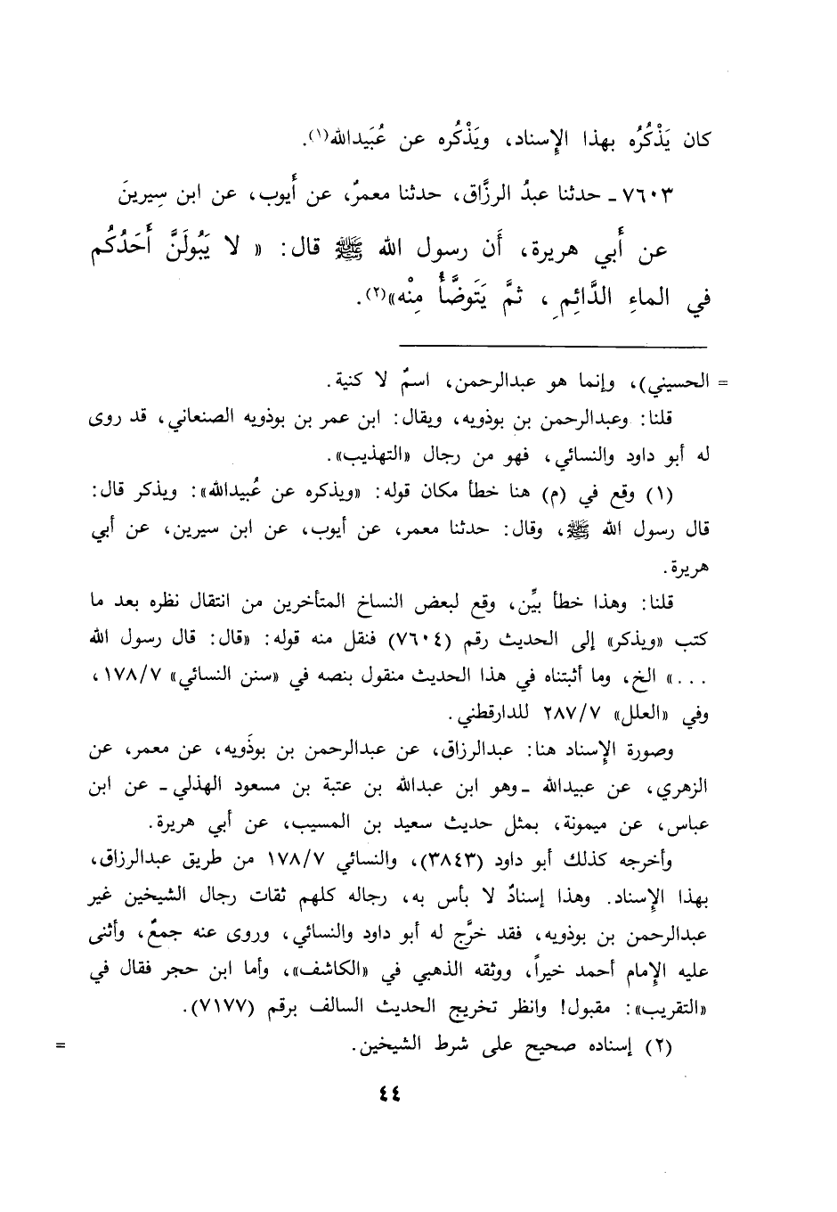 ٧٦٠٣ - حَدَّثَنَا عَبْدُ الرَّزَّاقِ، حَدَّثَنَا مَعْمَرٌ، عَنْ أَيُّوبَ، عَنِ ابْنِ سِيرِينَ، عَنْ أَبِي هُرَيْرَةَ، أَنَّ رَسُولَ اللهِ صَلَّى اللهُ عَلَيْهِ وَسَلَّمَ قَالَ: " لَا يَبُولَنَّ أَحَدُكُمْ فِي الْمَاءِ الدَّائِمِ، ثُمَّ يَتَوَضَّأُ مِنْهُ " (٢)